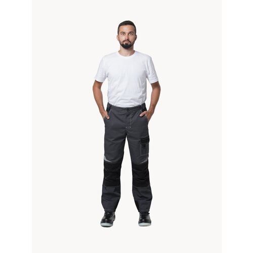 Брюки прямые; с застёжкой гульфика на тесьму - «молния»; с застежкой пояса на одну петлю и пуговицу; с боковыми внутренними карманами; с карманами и фигурными клапанами застегивающиеся на потайную липучку на боковом шве; с фигурным карманом на задней половинке; с карманами под инструменты; с наколенниками. Пояс брюк частично стянут резинкой ткацкой по бокам. В брюках предусмотрена лента светоотражающая (мелкодисперсная белая) 50 мм фигурной формы. Ткань/Материал верха — Смесовая с во пропиткой, Rodos Состав — 65% ПЭ, 35% ХБ Плотность/Толщина материала — 245 г/кв. м.