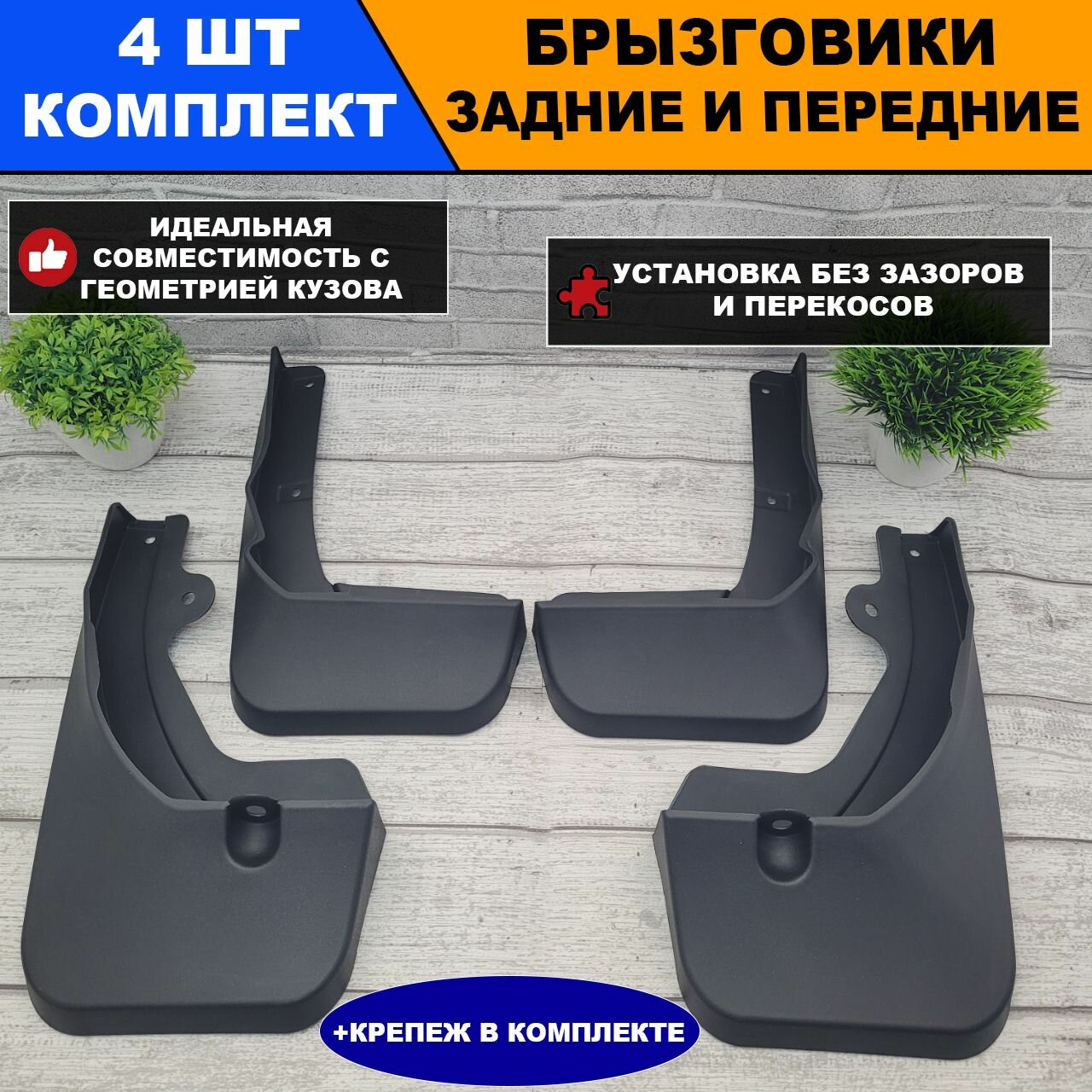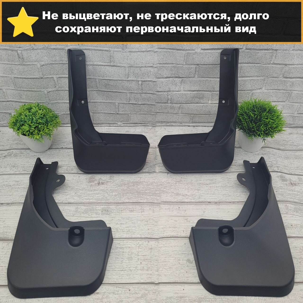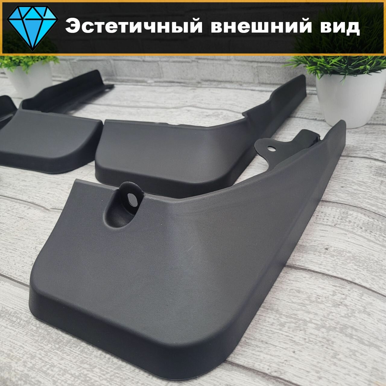 - Комплект состоит из 4 брызговиков, изготовленных из полимерного материала. Этот материал обладает высокой прочностью и долговечностью, что гарантирует долгий срок службы аксессуара.