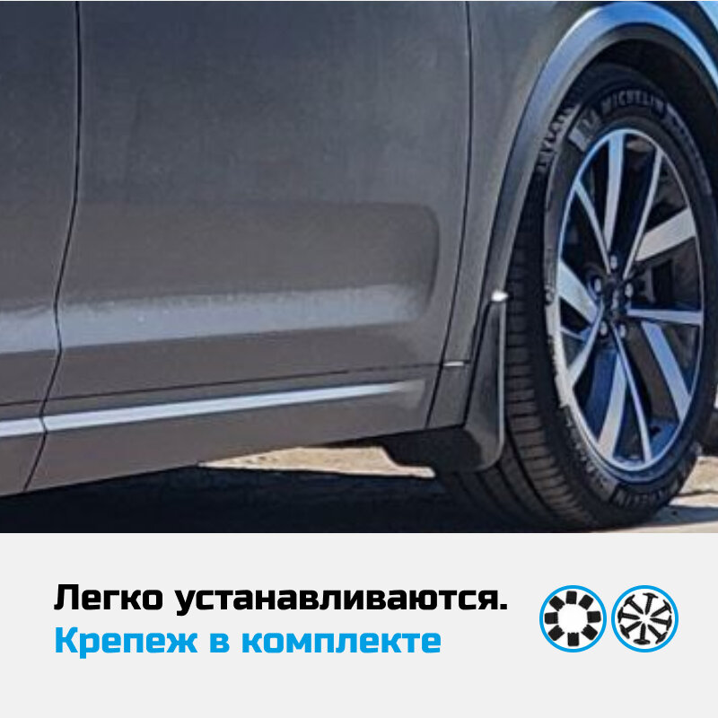 Брызговики надежно фиксируются в штатные технологические отверстия к задней и передней части крыла. Благодаря методу 3D сканирования автомобиля, изделия выглядят естественным продолжением колесной арки и гармонично вписываются во внешний облик авто.
