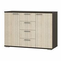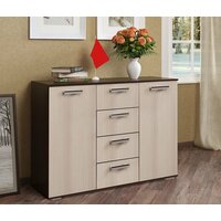 Комод предназначен для хранения вещей, белья и одежды и станет практичным элементом интерьера спальной комнаты, прихожей или гостиной. В составе своей комбинированной конструкции он имеет четыре выдвижных ящика на роликовых направляющих, а также две распашные створки, за которыми располагаются полки.