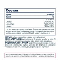 размер порции в капсулах/таблетках: 10; назначение: ускоряет процесс синтеза белка; способствует росту мышечной массы и улучшению процесса восстановления после физических нагрузок; уменьшает процент жира в организме во время низкоуглеводной диеты; увеличивает выносливость и силовые показатели; увеличивает выработку инсулина; рекомендации по применению: в дни тренировок рекомендуется принимать одну или две порции (1 порция - 10 капсул) за 10-30 минут до тренировки и сразу после тренировки; в остальные дни рекомендуется принимать между приемами пищи; для лучшего восстановления и с целью подавления катаболизма также рекомендуется прием перед сном и сразу после сна; Состав на одну порцию (10 капсул): L-лейцин - 2400 мг, L-изолейцин - 1200 мг, L-валин - 1200 мг. Состав: L-лейцин, L-изолейцин, L-валин, капсула (желатин).