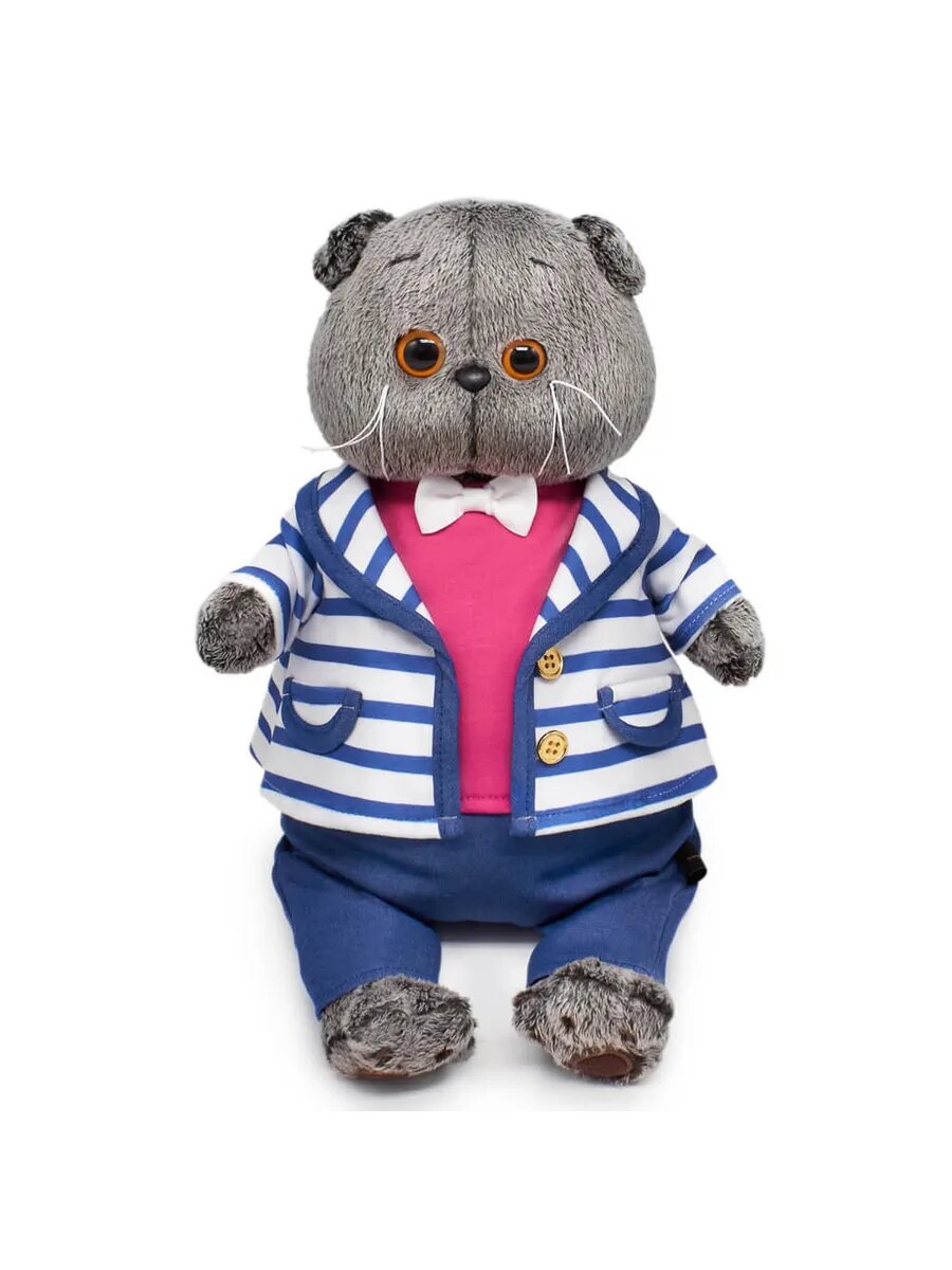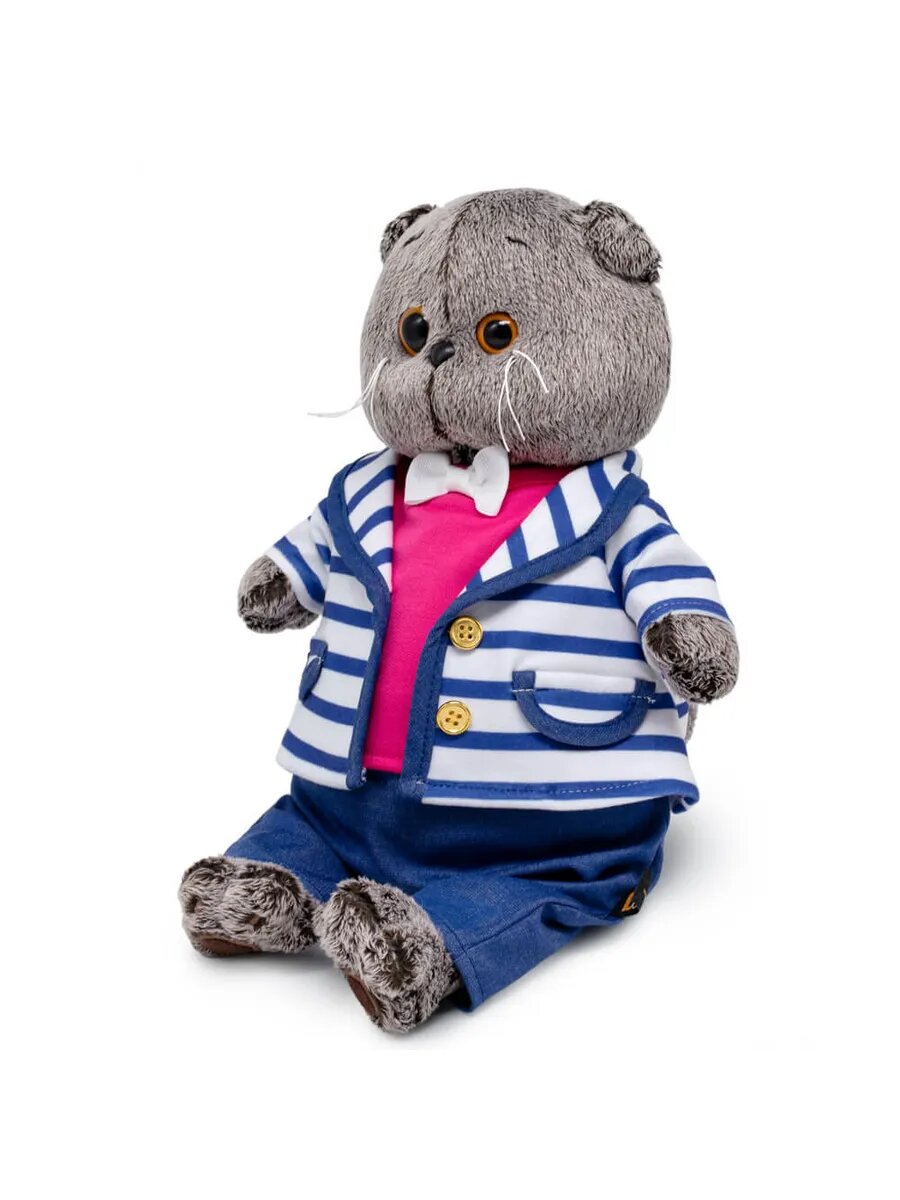 Кот Басик только на первый взгляд кажется тихоней и примерным мальчиком! Полосатый жакет по фигуре, элегантные синие штанишки и бабочка на шее - вы наверняка уже решили, что этот с виду интеллигентный Котик лишен озорства и совершенно не тянет на приятеля, с которым можно поиграть и побездельничать. Как бы не так! Взгляните в его медовые круглые глазки, дотроньтесь до шелковистой шерстки и почешите Котика Басика за ушком - мягкая игрушка BudiBasa тут же отзовется на любое предложение, будь это прогулка во дворе, игры в детской или отдых на мягком диване под любимые мультики.