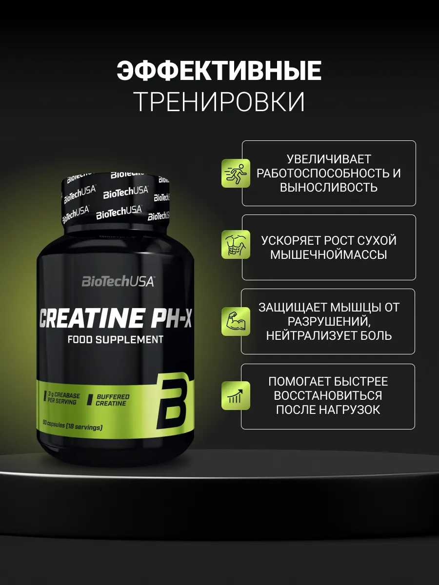 Creatine pH-X от BioTechUSA – это буферизированная форма моногидрата креатина. Добавка не вызывает дискомфорта (вздутия живота, судороги) и усваивается за несколько минут после поступления в организм. Эффект от приема добавки Creatine pH-X: • Креатин моногидрат способен повысить силовые показатели, что сделает каждую тренировку еще более интенсивной. • Содействует росту мышечной массы, делает мышцы более рельефными. • Способствует повышению концентрации. • Играет важную роль в снижении холестерина. Еще один плюс добавки – оптимальный уровень кислотности, создаваемый после растворения в воде. Он позволяет креатину усвоиться на 100% и защищает от пищеварительных проблем. способ применения Принимайте 2-6 капсул в день. 2 капсулы с утра на пустой желудок, 2 капсулы за 80 минут до тренировки и 2 капсулы через 20 минут после тренировки. За 60 минут до тренировки примите 100 грамм глюкозы, запивая стаканом воды. Для максимальных результатов принимайте 8-10 капсул в день. ингредиенты CreaBASE (буферная креатин формула), мальтодекстрин, антислеживающий агент (стеарат магния), оболочка капсулы (желатин, очищенная вода, красители: красный очаровательный АС, бриллиантовый синий FCF, диоксид титана, желтый закат FCF, тартразин).