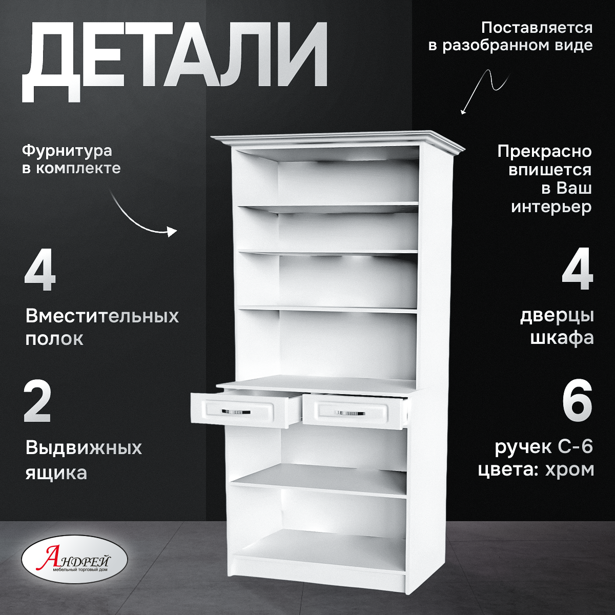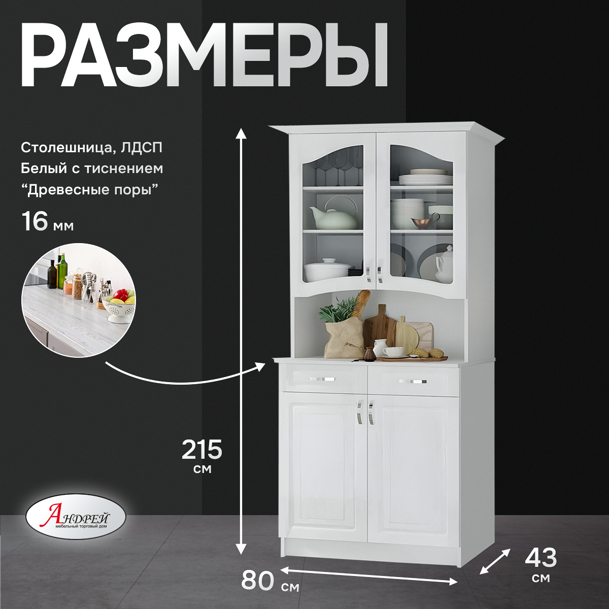 Буфет -это стильный и функциональный элемент мебели для гостиной или столовой. Буфет оснащен двумя верхними ящиками со стеклянными дверцами, что позволяет хранить посуду или декоративные предметы, а также двумя нижними ящиками для более крупных предметов. Дизайн буфета выполнен в стиле прованс с присутствием изящных деталей и утонченных линий, что делает его отличным выбором для любого интерьера. Размер: (ШхВхГ) 800х2150х430 Цветовое решение: Корпус: ЛДСП - Белый с тиснением "Древесные поры" Фасад: МДФ - Клен Белый/Клен кремовый/Клен Бирюза/Клен Серый/Дуб канадский/Дуб канадский белый Столешница: 16мм ЛДСП-Белый с тиснением "Древесные поры" Ручка: С-6 Каждый из буфетов Вы можете заказать в нужном Вам цвете. Товар поставляется в разобранном виде.