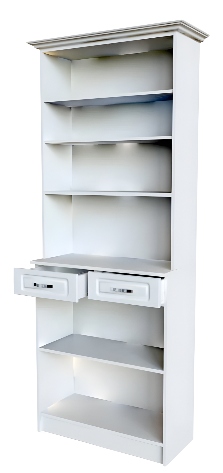 Буфет Прованс-08 имеет размеры (ШхВхГ) 800х2150х430 мм. Корпус и столешница выполнены из ЛДСП в белом цвете с тиснением "Древесные поры", а фасад - из МДФ в различных цветовых решениях: клен белый, клен кремовый, клен бирюза, клен серый, дуб канадский и дуб канадский белый. Фурнитура имеет хромированное покрытие.