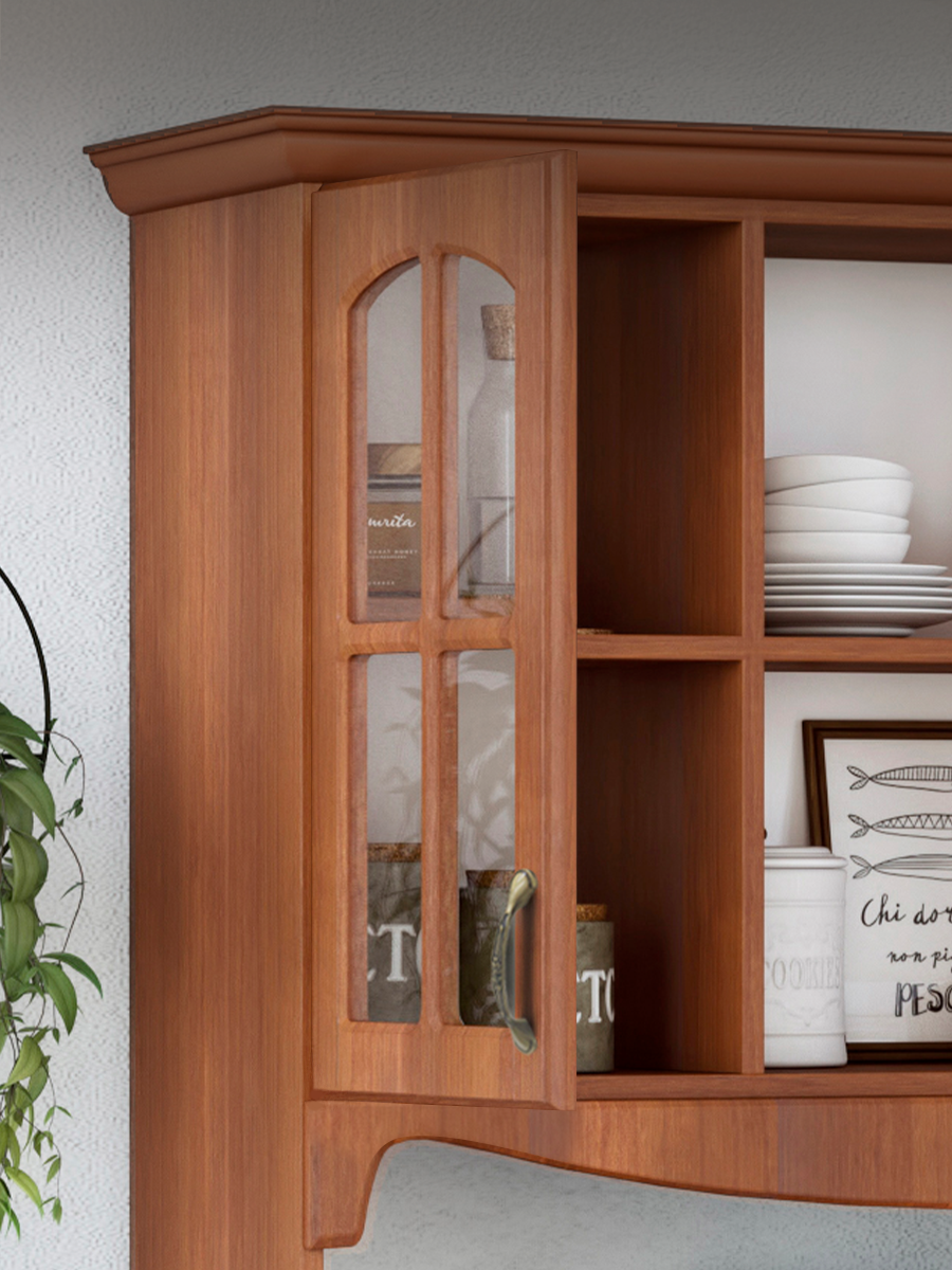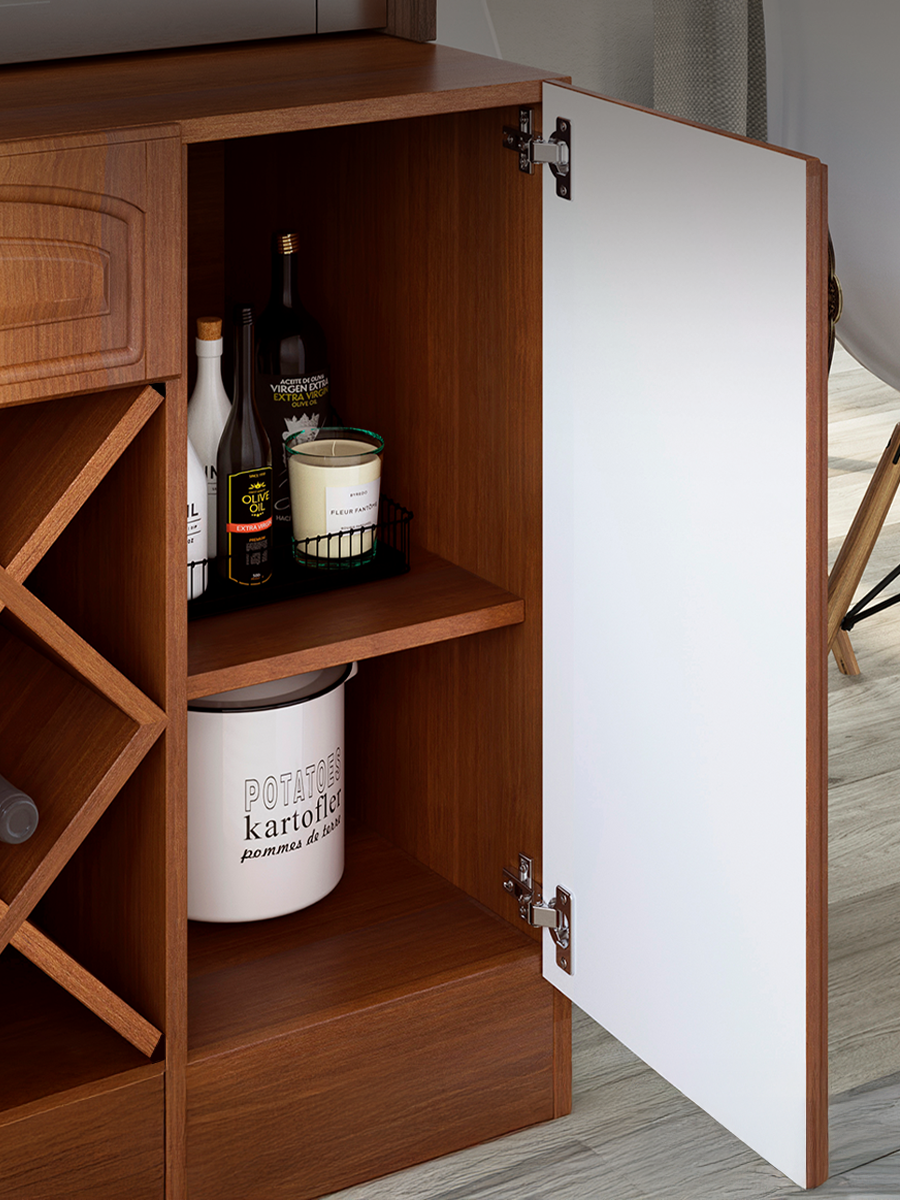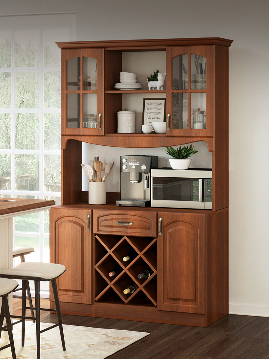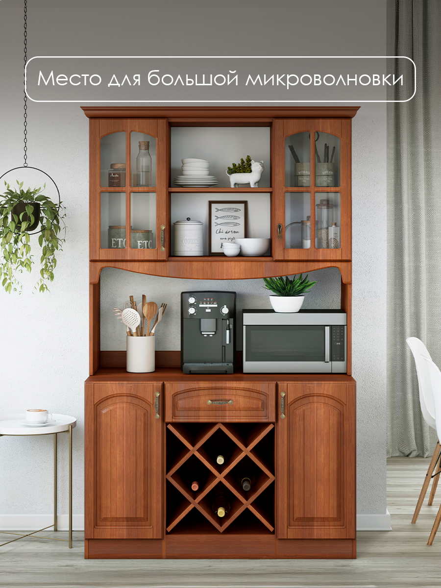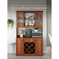Наш шкаф оснащен двумя отсеками для крупных кухонных приборов, такими как микроволновая печь или кофеварка, а также 11 полками и выдвижным ящиком для хранения мелких предметов и продуктов и съемной винной полкой. Благодаря большому пространству для хранения, вы сможете организовать все необходимые кухонные принадлежности и продукты в одном месте.