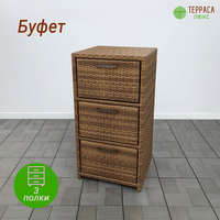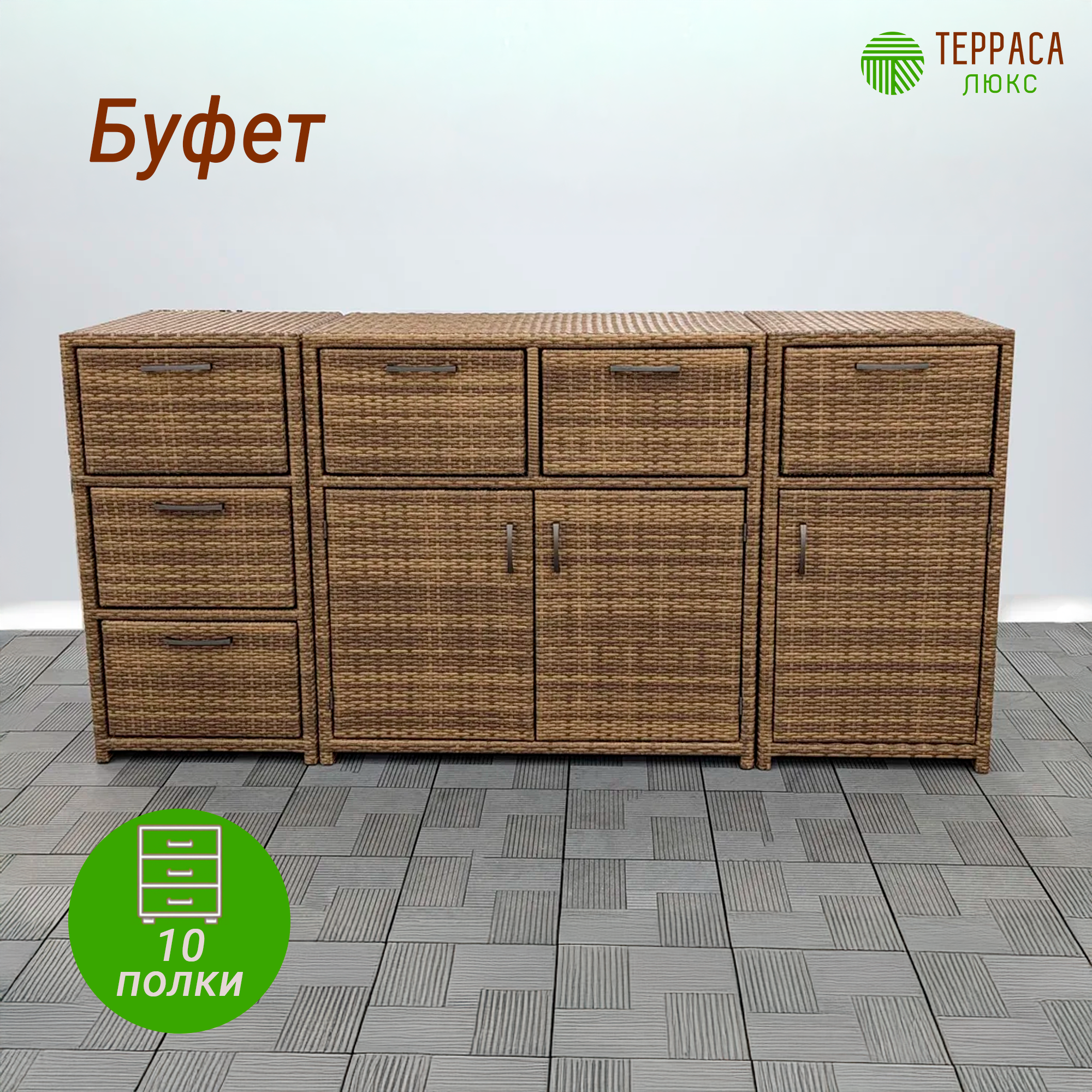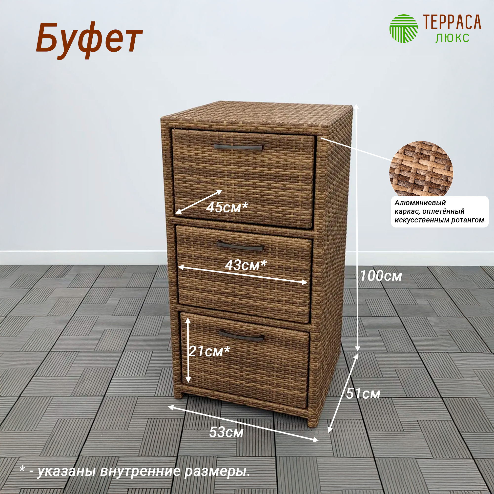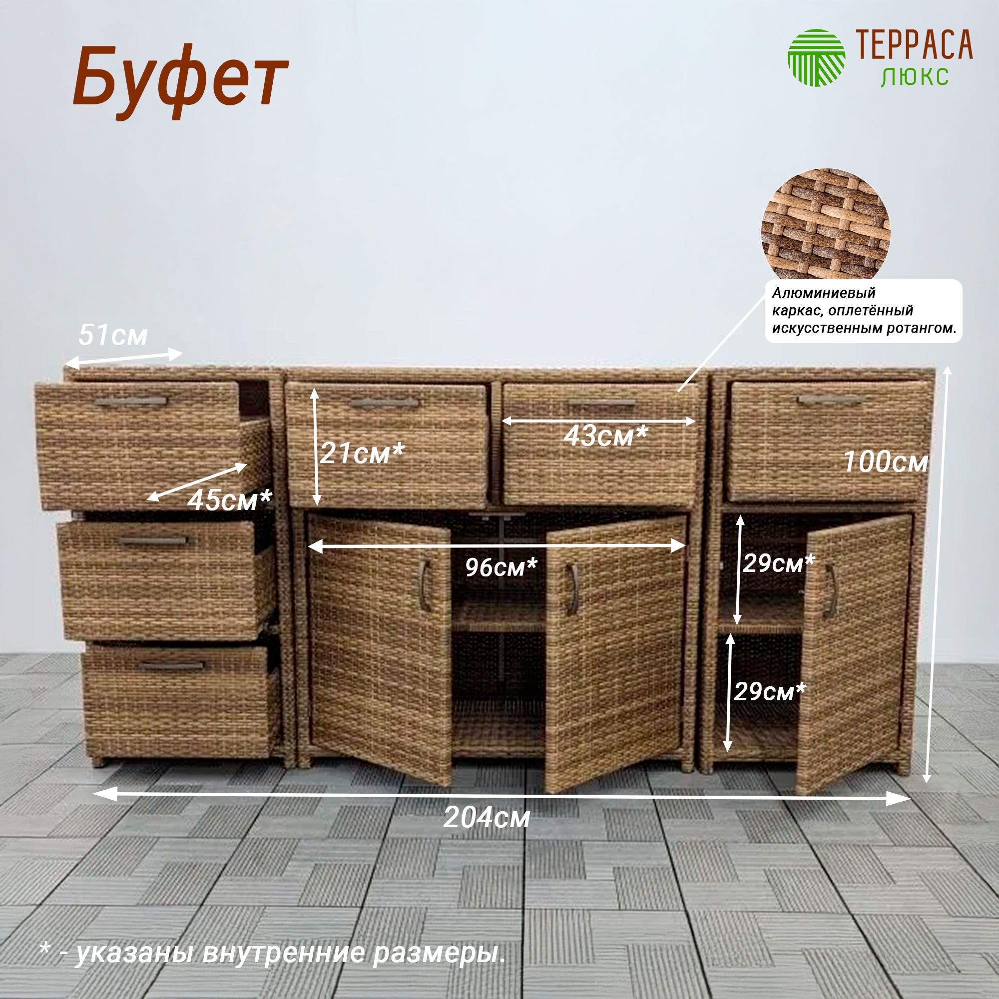 Буфет "терраса Люкс" изготовлен из прочного металла, что гарантирует его долговечность и надежность. Искусственный ротанг, использованный в отделке, придает буфету стильный и современный вид.