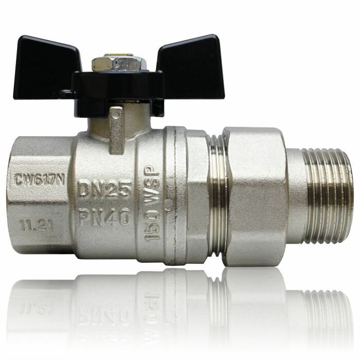 Кран Американка Н/В Ду-20 /1" Бабочка черная Bugatti OREGON 3220032 - шаровая, полнопроходная запорная арматура с внутренней и наружной резьбой (соединитель с накидной гайкой). Изделие выполнено из прочного и надежного материала - латуни, защищен от коррозии благодаря никелевому покрытию. Кран шаровый HB с разъемным соединением Bugatti Oregon бабочка усиленный применяется в качестве запорной арматуры в системах горячего и холодного водоснабжения, включая системы с питьевой водой, отопления, транспортировки сжатого воздуха и углеводородов, нефтепродуктов, на технологических трубопроводах, транспортирующих жидкости и газы, не агрессивных к материалам крана. Относится к запорной арматуре и не предназначен для регулирования потока. Позволяет создавать быстроразъемные гидравлические конструкции. Соединение представляет собой съемный патрубок и накидную гайку. Шаровой кран со съемным патрубком может быть установлен перед конечными элементами трубопроводов систем водоснабжения и отопления, которые требуют периодических работ по обслуживанию, например, радиаторов отопления, котлов и прочее.