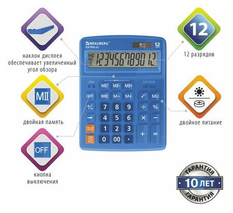 Внимание! Товар продается комплектом:[Калькулятор настольный BRAUBERG EXTRA-12-BU (206x155 мм), 12 разрядов, двойное питание, синий, 250482] X 3 шт. Настольный калькулятор BRAUBERG EXTRA-12-BU. Большой дисплей с увеличенным углом обзора, устойчивый корпус и клавиатура с цветной дифференциацией для эффективной работы с максимальным комфортом.