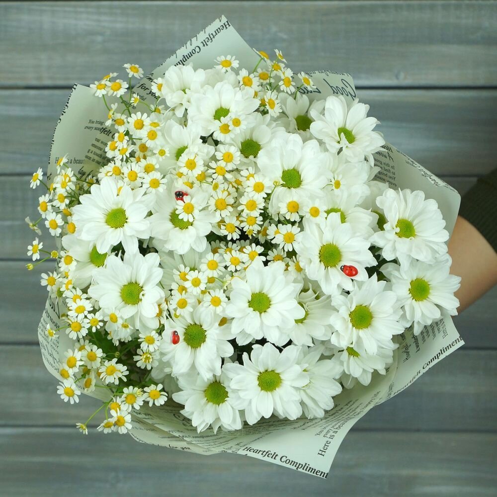 Букет «Букет Маркет», из ромашек, хризантем, танацетума, обертка, высота 58 см: сравнение цен, характеристики, фото, актуальное наличие и цены.