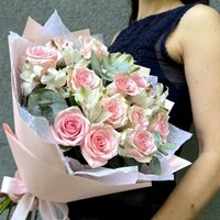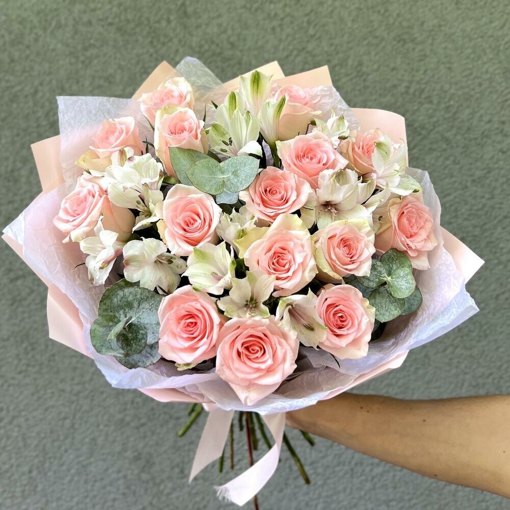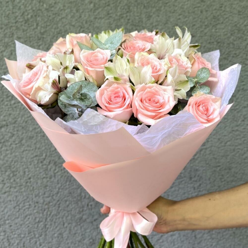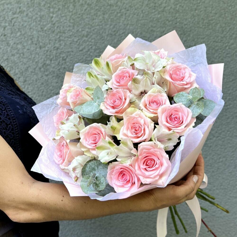 Купить Букет из розовых роз и белой альстромерии c эвкалиптом М с доставкой по всей России. Букет из розовых роз и белой альстромерии c эвкалиптом М: сравнение цен, характеристики, фото, актуальное наличие и цены.