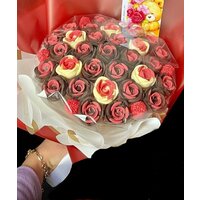 Букет выполнен в виде роз и ягод из шоколада, что делает его не только вкусным, но и красивым подарком.