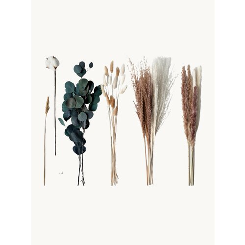 Сухоцветы для декора ARANTA - это целый мир, скрытый в миниатюре. Каждая деталь этого набора тщательно продумана: от зеленых стабилизированных веточек эвкалипта и пампасной травы до хлопок цветы и сухоцвет пшеницы. Этот готовый микс сухих цветов отличается своей уникальностью: он одновременно нежный и пронзительный, спокойный и яркий.