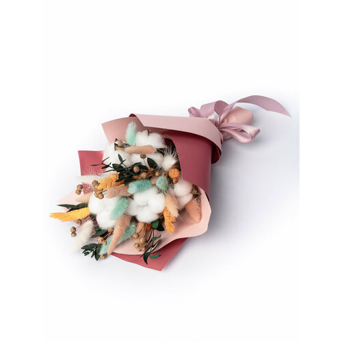 Букет сухоцветов в праздничной упаковке. Прекрасно подойдет в подарок как аналог живым цветам так и самостоятельный презент. Такой букет будет радовать больше года, безуходный , не требует полива и экологичный. Растения могут немного осыпаться, так как это природный материал. В составе нежный хлопок, пушистый лагурус, фаларис, веточки эвкалипта, звенящие шарики льна. Упакован в подарочную коробку. Ваш подарок будет всегда напоминать о вас, идеальный вариант букета. В комплекте можно подарить рамочку с сухоцветами нашего бренда. Коробка размер длинна 33, ширина 25, высота 10 см. Размер самого букета: высота 30 см, ширина 17 см. Букет в упаковке дополнительно упакован воздушно-пузырчатой пленкой и транспортной коробкой.
