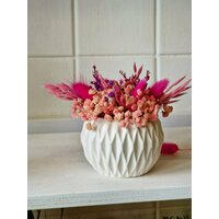 букет стабилизированных цветов во флористической губке и гипсовое кашпо в цвете дымка