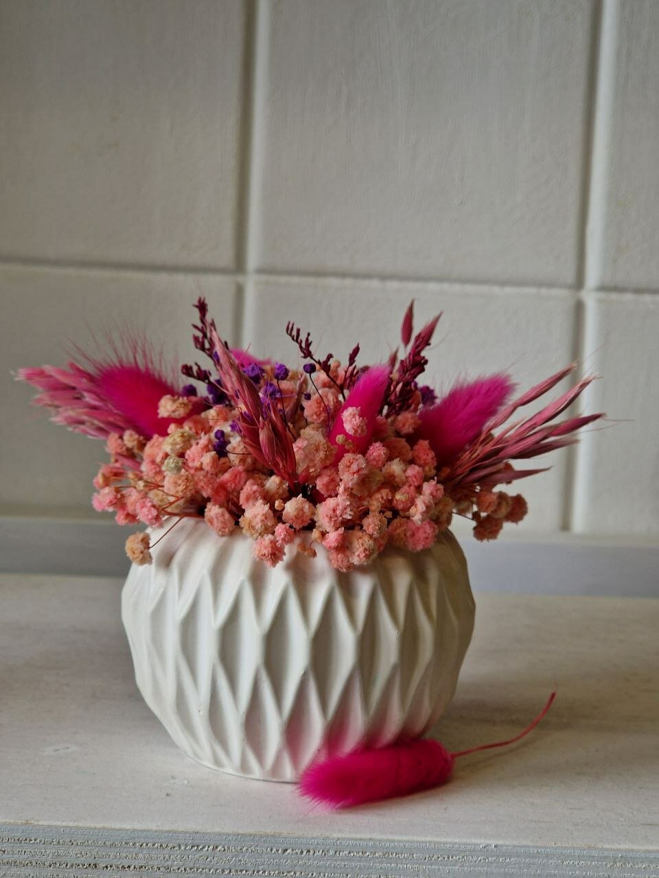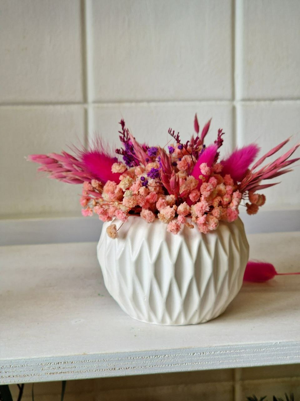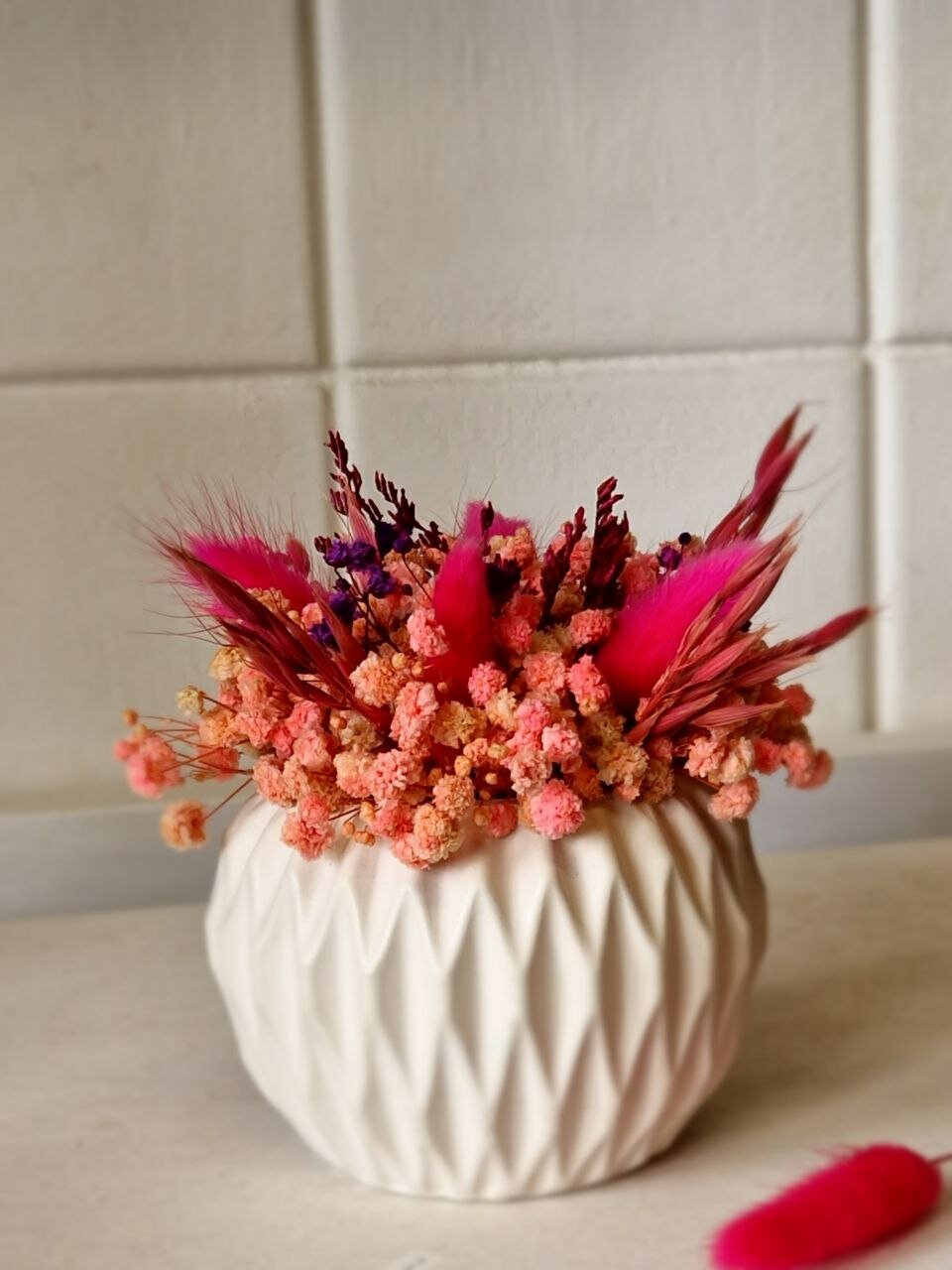 Белое кашпо с рифлеными гранями придает букету особый шарм и элегантность. Такое кашпо не только украшает букет, но и служит надежной подставкой, предотвращая его падение.