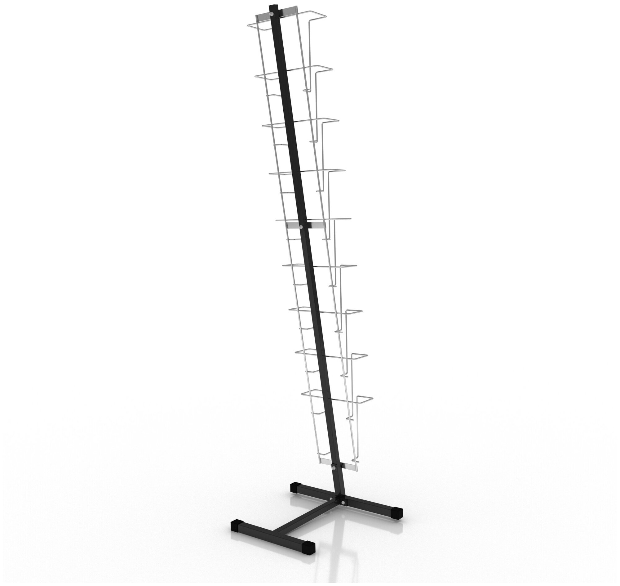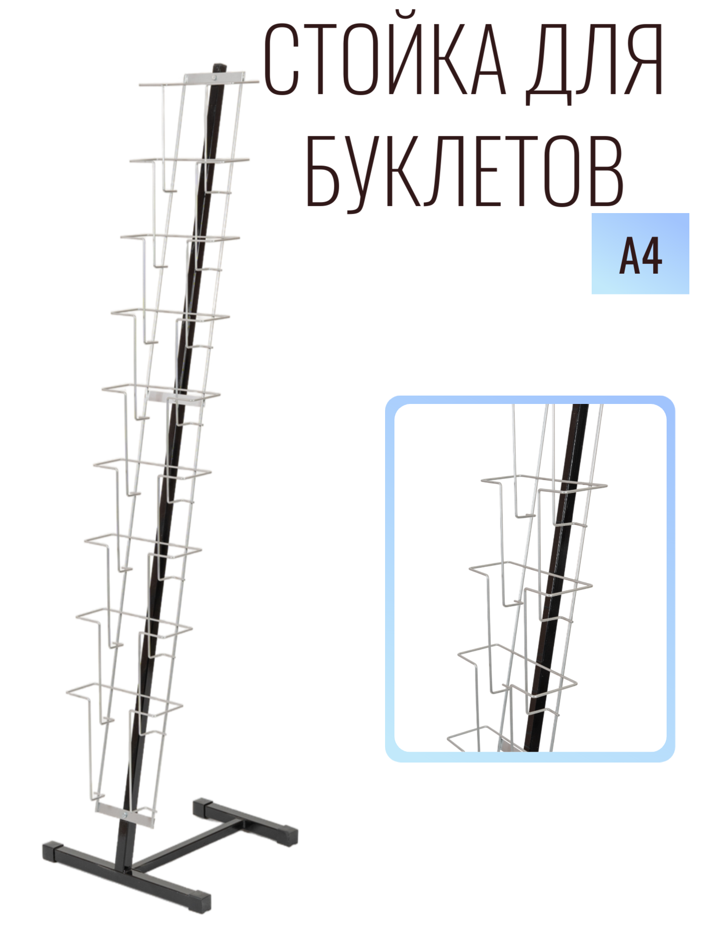 Универсальная напольная стойка для брошюр формата А4. Предназначена для размещения любой полиграфической продукции формата А4: книг, журналов, буклетов, брошюр, информационных листков. Стойка для брошюр К010 может использоваться как стенд для размещения информации или рекламы в магазинах, на выставках, в театрах, или любых тематических мероприятиях. Тип конструкции: разборный. Каркас изготовлен из стальной профильной трубы, карманы – из стальной проволоки. Стойка информационная напольная покрыта порошковой краской. Стойка для буклетов и брошюр находится под наклоном в 11° (наиболее эффективный угол для демонстрации печатной продукции), оснащена 9 карманами, похожими по форме на подставки для книг, глубина кармана — 5,5 см. Размер изделия: 410х390х1610 мм