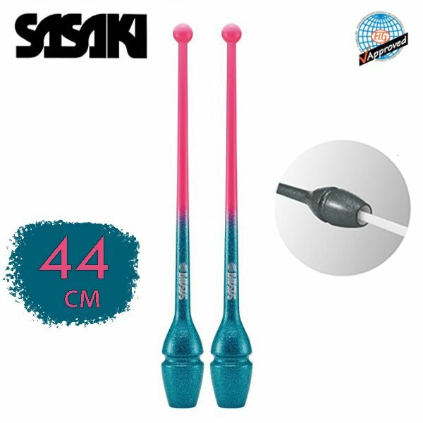 Булавы SASAKI 44см с блестящим напылением. Двойная система фиксации: легкая фиксация - для быстрого движения, сильная фиксация - для динамического движения. Предметы Sasaki признаны лучшими в мире, с ними легко учиться новичкам и работать профессиональным гимнасткам - проверено годами! Резиновые булавы SASAKI состоят из стекловолоконной основы, которая придает им прочности и уританового покрытия сверху, которое, как и литая форма, сокращает возможность появления трещин и расколов и содействует динамичным броскам во время выступления. Булава, если вытянуть её вдоль руки, держа в кисти за маленькую головку, должна доходить до середины плеча так, чтобы было удобно её держать и выполнять различные вращения булавой. Булава не должна касаться носа или подбородка. Хранить булавы необходимо в специальном чехле. Чехол для булав поможет сохранить булавы в чистоте и защитить от возможных царапин в сумке. Булавы можно украсить при помощи разноцветных Обмоток. Существует большой выбор клейких обмоток самых разных цветов и оттенков, из которых вырезаются узоры и наклеиваются на булавы.