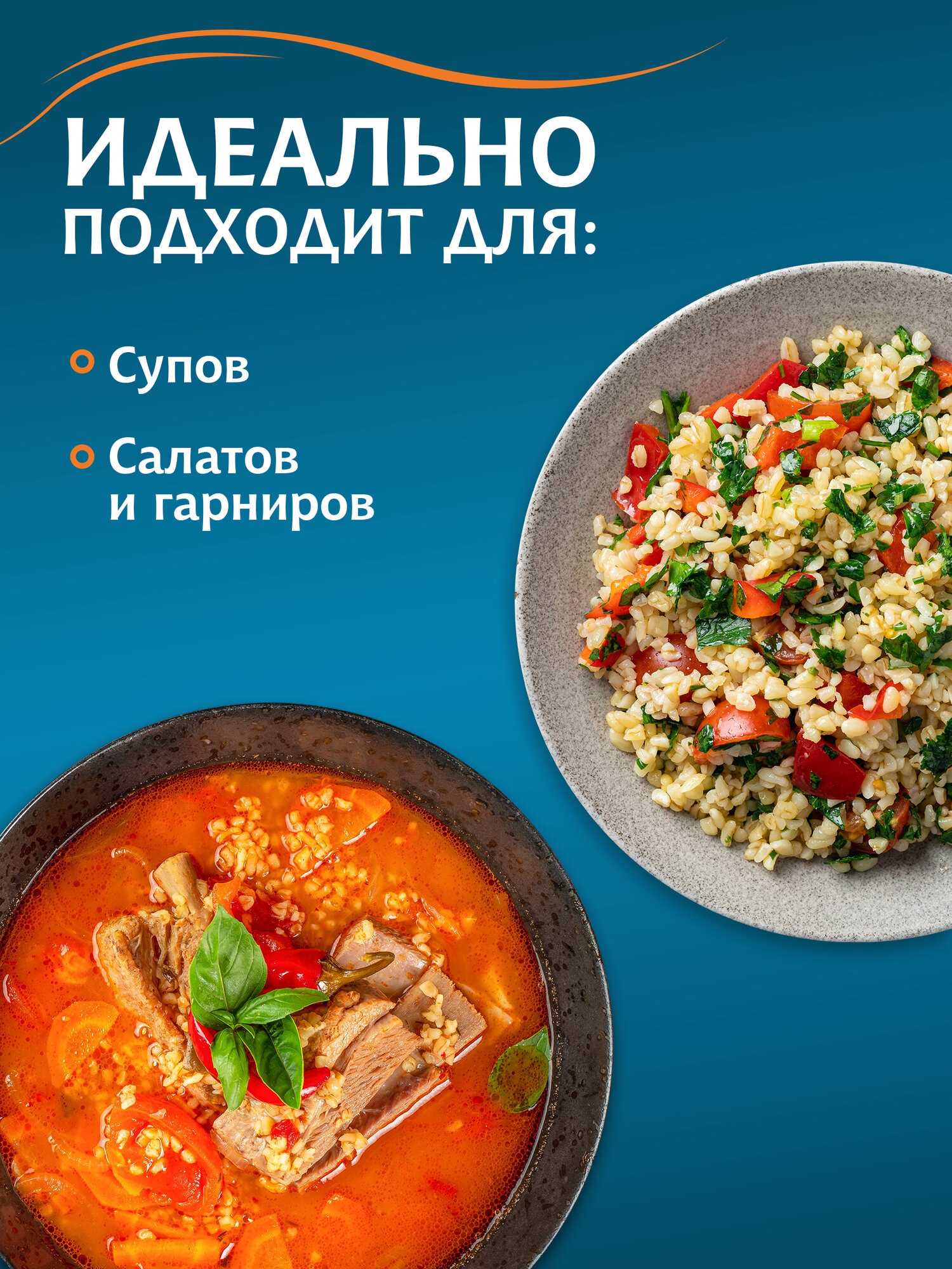 При приготовлении зерна сохраняют свою форму, оставаясь рассыпчатыми, что делает его идеальным для приготовления супов, гарниров и салатов. Благодаря своей универсальности, булгур сочетается с различными продуктами, включая курицу, мясо и овощи.