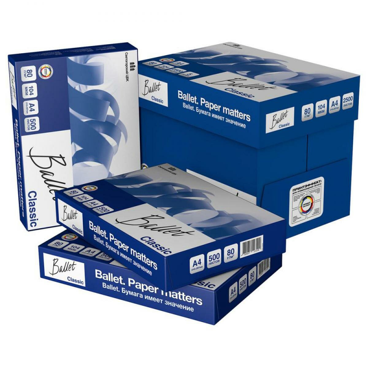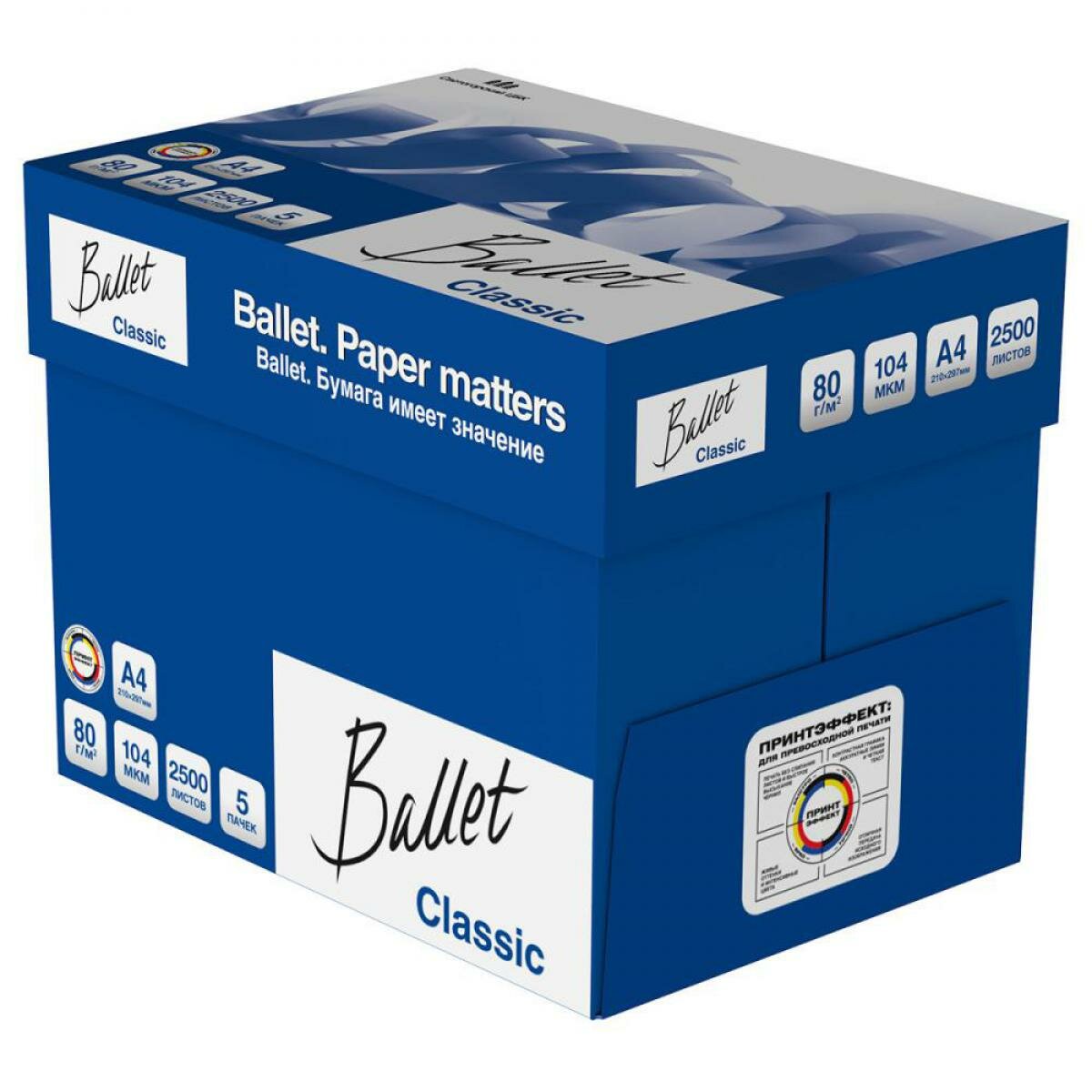 Офисная бумага BALLET CLASSIC А4, 80г/кв. м, 5 шт. высокого качества, изготавливается в соответствии с мировыми стандартами качества. Листы безупречно белые, показатель — 153 % CIE, на них хорошо будут смотреться офисные документы. За счет своей высокой плотности (80 г/кв. м), бумага эффективно совмещается практически с любым офисным оборудованием. Класс В, толщина листа — 104 мкм, оптическая яркость — ISO 96 ± 2%. Бумага гладкая и непрозрачная (не менее 92%), это гарантирует качество печати на высшем уровне. В пачке содержится 500 листов, в упаковке 5 пачек. Компания с 2008 года ввела технологию ColorLok для достижения лучшего качества печати и эксплуатации бумаги. Производитель International Paper. Приобрести офисную бумагу BALLET CLASSIC А4, 80г/кв. м, 5 шт. можно в Москве в торговом центре METRO. Формат: А4. Плотность: 80 г/кв. м. Оптическая яркость: ISO 96 ± 2%Класс: В. Непрозрачность: не менее 92%. Толщина листа: 104 мкм. Белизна: 153 % CIEУпаковка: 5 пачек. Производитель: International Paper. Страна: Россия.