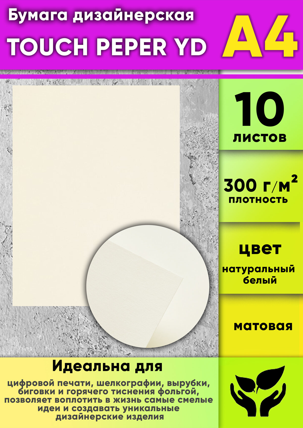 Touch Paper идеально подходит для цифровой печати, шелкографии, вырубки, биговки и горячего тиснения фольгой, позволяя воплотить в жизнь самые смелые идеи и создавать уникальные дизайнерские изделия.