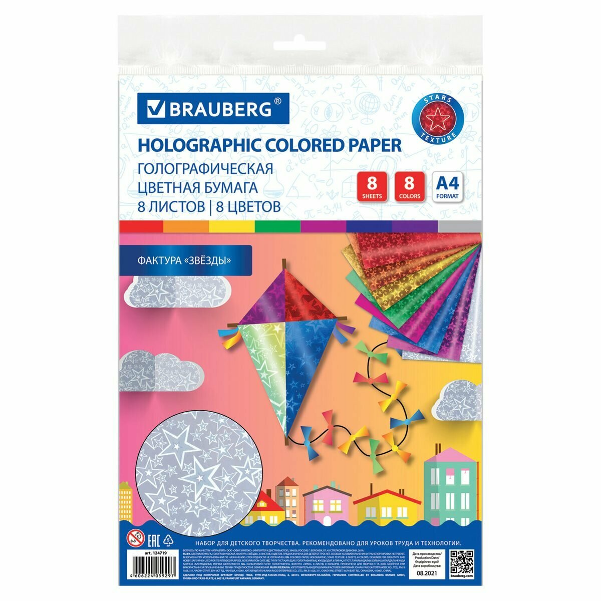 Купить Бумага цветная голографическая Brauberg (8 листов, 8 цветов, А4, рисунок из звезд, 210х297мм) (124719), 25 уп. с доставкой по всей России.