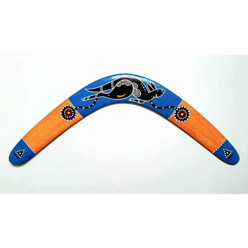Австралийский бумеранг с традиционным орнаментом и изображением кенгуру на ярком голубом фоне: