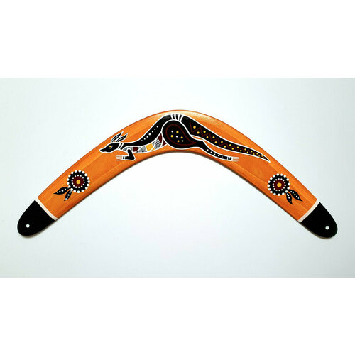 Австралийский бумеранг с традиционным орнаментом и изображением кенгуру, а также символа солнца:
