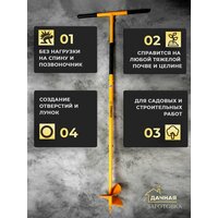 Пользоваться изделием просто: установите его перпендикулярно поверхности земли и вращайте ручку по часовой стрелке. Зубья из высокопрочной стали быстро входят в грунт, а работа практически не отнимает физических сил. Также вы с лёгкостью можете регулировать глубину бурения.