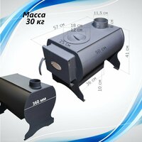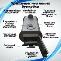 Печь буржуйка от производителя «Вятская Печная Компания» предназначена для отопления помещений до 50 м3, садовых домиков, гаражей, теплиц, подсобных помещений. Дровяная печь для дома изготовлена из конструкционной стали толщиной 3 мм, покрыта черной термостойкой краской. Верхняя горизонтальная поверхность корпуса буржуйки быстро нагревается и может использоваться для приготовления или разогрева пищи. Варочная поверхность изготовлена из стали 4 мм. На варочной поверхности имеются 2 чугунных кольца разного диаметра, что позволяет изменять размер отверстия в зависимости от посуды. Круглая топка выполнена из металла 3 мм. Преимущества круглой топки: 1. Быстро нагревается, что снижает перерасход топлива. 2. Круглая форма лучше держит тепло и отводит дым. 3. Долго служит без риска прогорания стенок. В круглой топке огонь не ударяется в углы, тем самым не выжигая металл. Печка буржуйка состоит из круглой топки, зольного ящика, чугунного колосника, отбойника пламени, 2 чугунных колец. Труба в комплект не входит. Дверца с отбойником, что исключает возможности её деформации. Для отвода золы из топочной камеры в зольник буржуйка на дровах имеет чугунный колосник. Дымоход диаметром 115 мм. В дымоходе установлен отбойник пламени, благодаря этому пламя не уходит прямо в дымоход, а повторно нагревает стенки. С отбойником КПД буржуйки возрастает! Экономный расход топлива. Дровяная печь для дачи работает на твердом топливе. Длина полена до 500 мм. Буржуйка – это идеальное бюджетное решение для обогрева небольшого помещения, дачного дома или гаража.