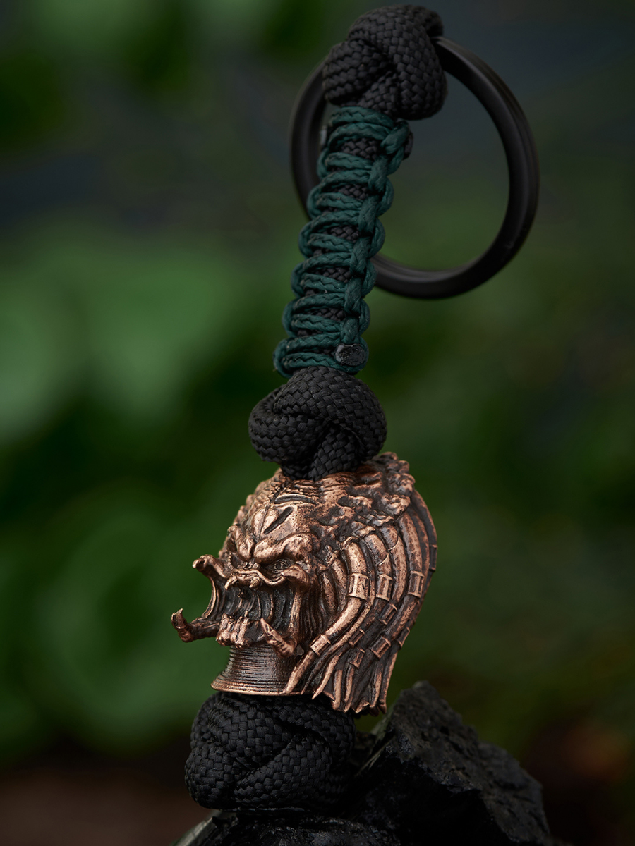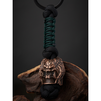 Бусина на темняк выполнена из бронзы в виде популярного персонажа Хищника. Темляк ручной работы сплетен нашими мастерами из прочного шнура паракорда черного цвета. Декорирован бусиной ручной работы. Тип узла "бриллиантовый" или "темлячный" отличается своей прочностью. Темляк - отличный подарок любому мужчине, оригинальный брелок для ключей или сумки. Охотники, туристы, любители активного отдыха могут использовать его по прямому назначению - как аксессуар для ножа. Длина изделия 10 см (кольцо-карабин + паракорд + бусина). Размер бусины: 2х2 см