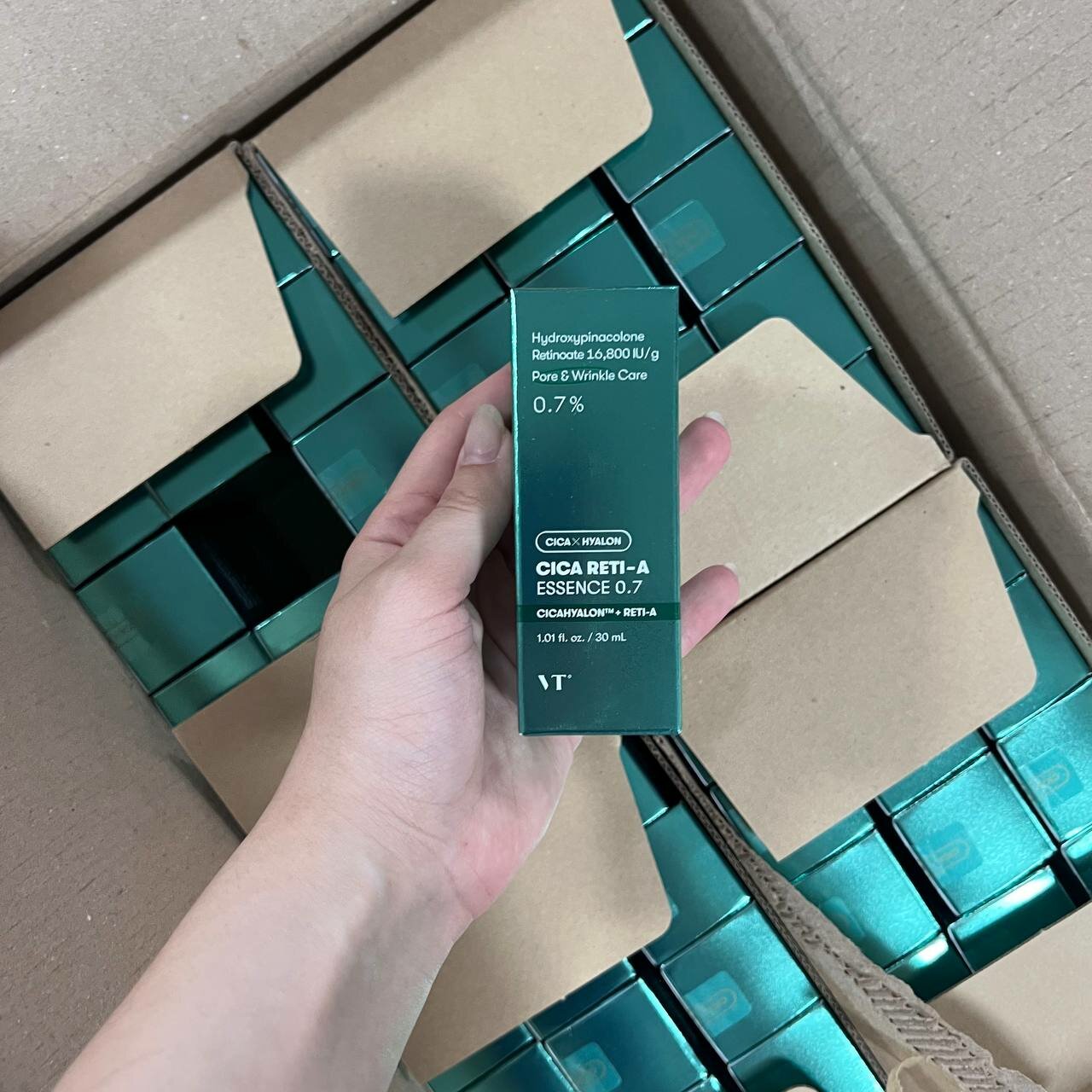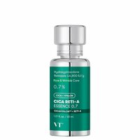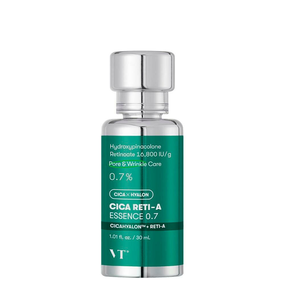 Бустер- эссенция с ретинолом VT Cosmetics Cica Reti-A Essence 0.7  предназначена для ухода за порами, осветления и выравнивания тона кожи, а также для повышения упругости и эластичности кожи. Ретинол (гидроксипинаколона ретиноат) в составе эссенции стимулирует синтез коллагена и обновление эпидермиса, разглаживает мимические морщины и препятствует их появлению в дальнейшем, осветляет и выравнивает тон кожи, делает пигментацию и постакне менее заметными. Также ретинол заживляет высыпания, возвращает лицу здоровый и ухоженный вид. Запатентованный комплекс CICAHYALON, сочетающий экстракты центеллы азиатской и 3 вида гиалуроновой кислоты, оказывает успокаивающее действие на раздраженную и чувствительную кожу. Эссенция интенсивно стимулирует обновление клеток эпидермиса, ускоряя естественные процессы ороговения и отшелушивания. Средство снижает риск развития воспалений и появления акне — обеспечивает эксфолиацию омертвевших клеток, излишков себума и регулирует активность сальных желёз. Благодаря регулярному обновлению кожа приобретает ровный тон без следов постакне и возрастной пигментации и текстуру, так как продукт уменьшает размер и глубину пор, разглаживает мимические и статические морщины. Эссенция восстанавливает водный баланс кожи, укрепляет липидный барьер и защищает кожу от обезвоживания, предотвращает возникновение сухости и шелушений. Подходит для всех типов кожи.  Способ применения: Нанесите небольшое количество средства похлопывающими движениями на очищенную кожу, после использования тоника. Внимание! Бустер-эссенция может вызывать ощущение тепла и покраснение после нанесения. Полный состав: Water, Butylene Glycol, Dimethyl Isosorbide, 1,2-Hexanediol, Niacinamide, Hydrogenated Poly (c6-14 Olefin), Glyceryl Stearate, Cetyl Ethylhexanoate, Polyglyceryl-3 Methyl Glucose Distearate, Pentaerythrityl Tetraethylhexanoate, Behenyl Alcohol, Hydrogenated Vegetable Oil, Hydroxypinacolone Retinoate (0,7%), Dimethicone, Polyglyceryl-6 Stearate, Stearic Acid, Cetearyl Alcohol, Polyacrylate-13, Carbomer, Betaine, Tromethamine, Polyisobutene, Ethylhexylglycerin, Centella Asiatica Extract (104,5  ppb), Polyglyceryl-6 Behenate, Adenosine, Sodium Hyaluronate, Allantoin, Polysorbate 20, Drumstick Seed Extract, Gluconolactone, Bakuchiol, Capryloyl Salicylic Acid, Sorbitan Isostearate, Ceramide NP, Cholesterol, Hydroxystearic Acid, Glycerin, Tocopherol, Drumstick Seed Oil, Ascorbic Acid, Phytosphingosine, Pentylene Glycol, Retinol, Hydrogenated Lecithin, Lecithin, Caprylyl Glycol, Sodium Phosphate, Trehalose, Bht, Acetyl Hexapeptide-8, Propolis Extract, Madecassoside, Asiaticoside, Asiatic Acid, Madecassic Acid, Bha, Sh-oligopeptide-1, Sh-polypeptide-1, Disodium EDTA, FragranceТолько для наружного применения. Хранить в недоступном для детей месте. В случае появления раздражения немедленно прекратить использование. Хранить при температуре от +5*С до +25*С.
