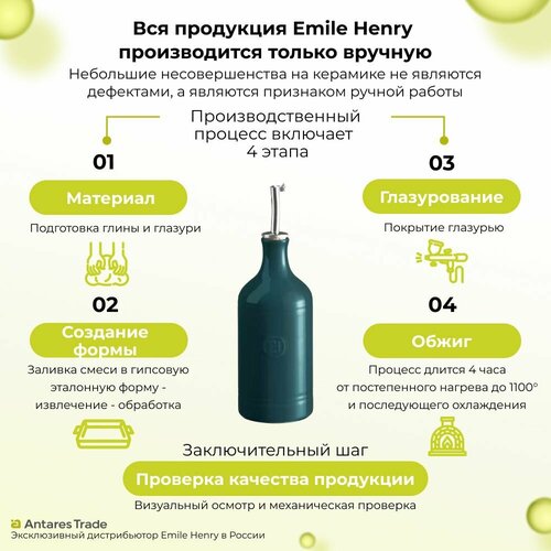 Emile Henry началась в 1850 году с Жака Анри. Керамическая посуда ручной работы. Аксессуары для дома. Кухонная посуда и инвентарь изготовлены из огнеупорной керамики Hr (high Resistance) С внешней стороны покрыта стекловидной глазурью. Устойчива к сколам, трещинам и царапинам. Не боится ни ножа, ни вилки. Выдерживает интенсивное механическое воздействие. Риск повредить поверхность изделия металлическими кухонными приборами отсутствует. Кухонная посуда и инвентарь не впитывает запахи, никак не окрашивается. Красивая подача для сервировки стола. Бутылка керамическая для хранения уксуса с пробкой объем 450 мл. Применима и для масла. Элегантный аксессуар для хранения столового уксуса с травами или яблочного. Емкость для хранения изготовленная из натурального материала. Керамика защищает уксус от света, сохраняя все его ароматы и вкус. Помогает предотвратить эти изменения, сохраняя качество продукта на долгое время. Натуральная пробка и мерный колпачок с дозатором из нержавеющей стали изолируют уксус от воздуха и позволяют легко использовать для приготовления маринада или приправы оригинального винегрета даже за столом. Округлая форма Vinegar Balloon придает ему большую маневренность и делает его дополнением к бутылке для масла. Бутылка под уксус керамическая идеальна, чтобы хранить уксус, так как защищает от света. Рекомендуется использовать уксус, концентрация которого не превышает 9%. Не рекомендуется использования уксусной эссенции. Глиняная посуда для кухни экологически чистая и безопасна для здоровья. Не содержит кадмий, никель и свинец. Кухонная утварь емкость для уксуса в форме сосуда- стоящий подарок для женщин к Новому году, коллегам, на 8 марта на Новый год и Рождество. Отмоется без проблем как в посудомоечной машине, так и вручную. Глазурованная часть логотипа представляет собой роскошное воплощение брендинга и сохранение фирменного стиля. Гарантия на продукцию 10 лет.