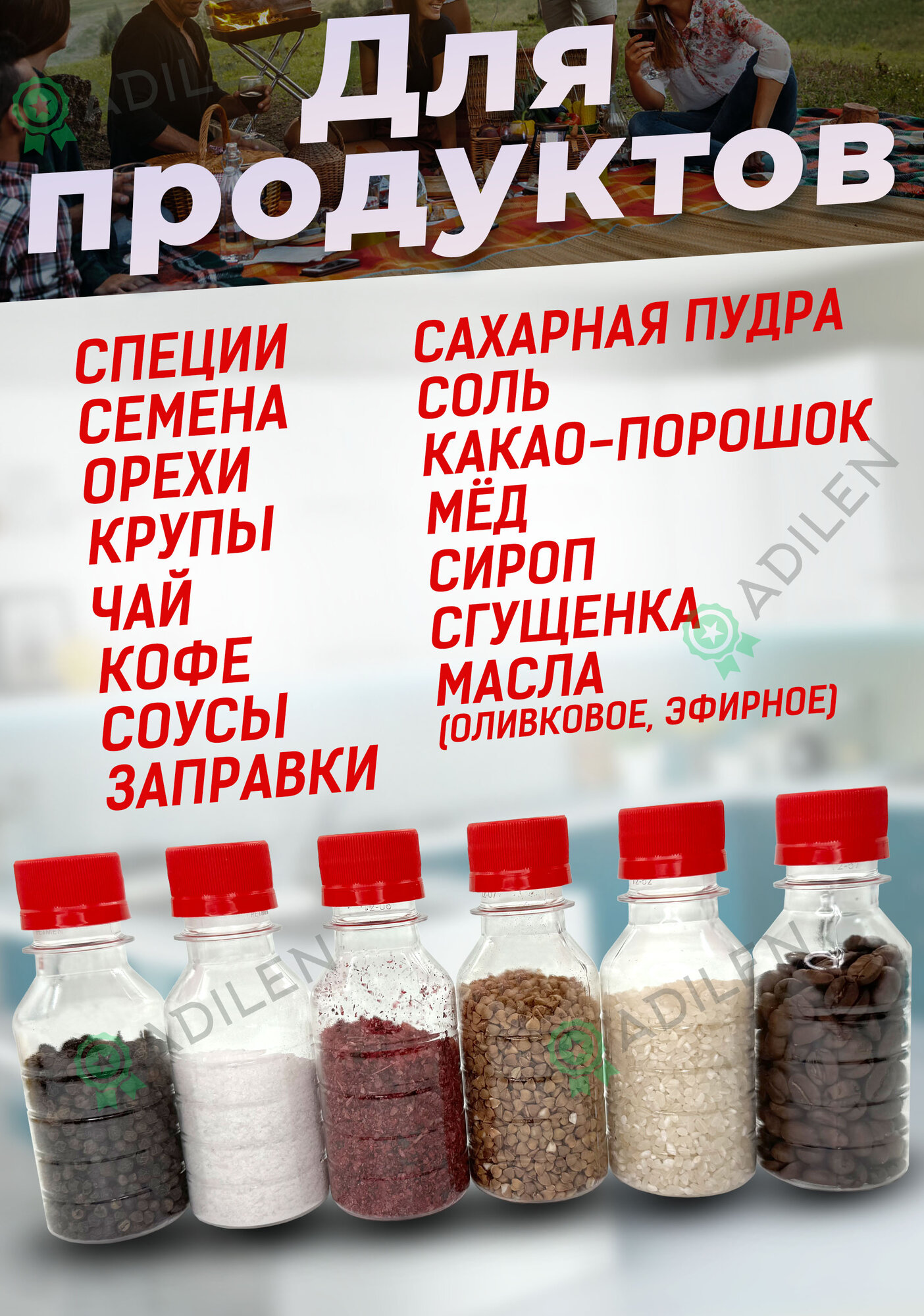 Набор из 330 пластиковых бутылочек ПЭТ вместимостью 100 мл подойдет для хранения воды, красителей, косметики, химических реагентов, фасовки сыпучих материалов, для художественного творчества и пищевых продуктов. Они также могут использоваться для провоза жидкости на борту самолета: согласно регламенту, один человек может провозить в салоне не более одного литра жидкости, при условии, что она будет разлита по бутылочкам емкостью не более 100 мл. Дорожный набор состоит из 330 флаконов вместимостью 100 мл, выполненных из прозрачного пэтф, и 330 пластиковых накручивающихся крышек.