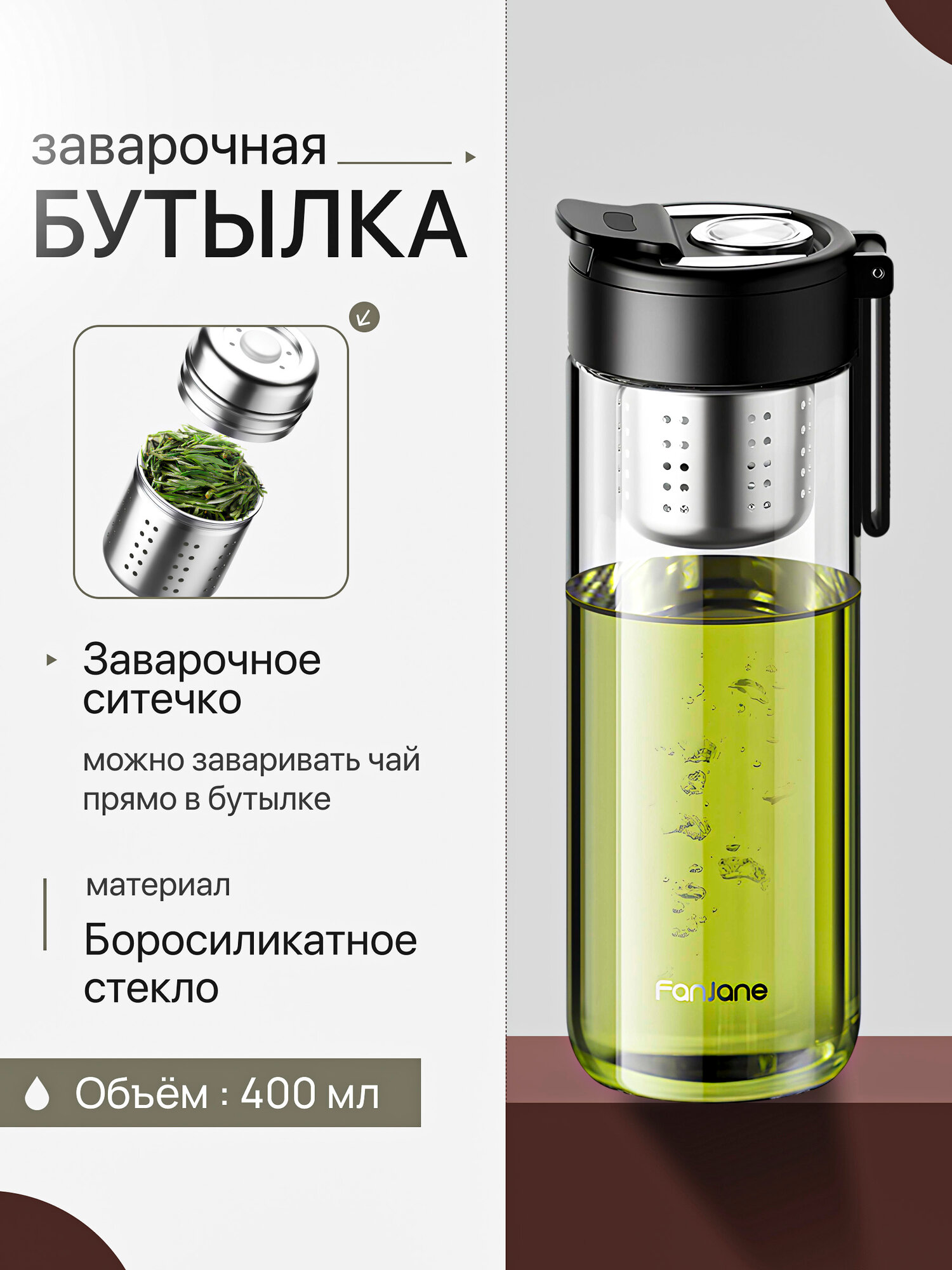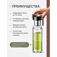 Стеклянная заварочная бутылка CFPRESS — это современное решение для ценителей чая, травяных и фруктовых настоев. Она объединяет удобство термокружки, функциональность чайника и надёжность термобутылки. Идеально подходит для использования дома, в офисе, в автомобиле, на прогулке или в путешествии.