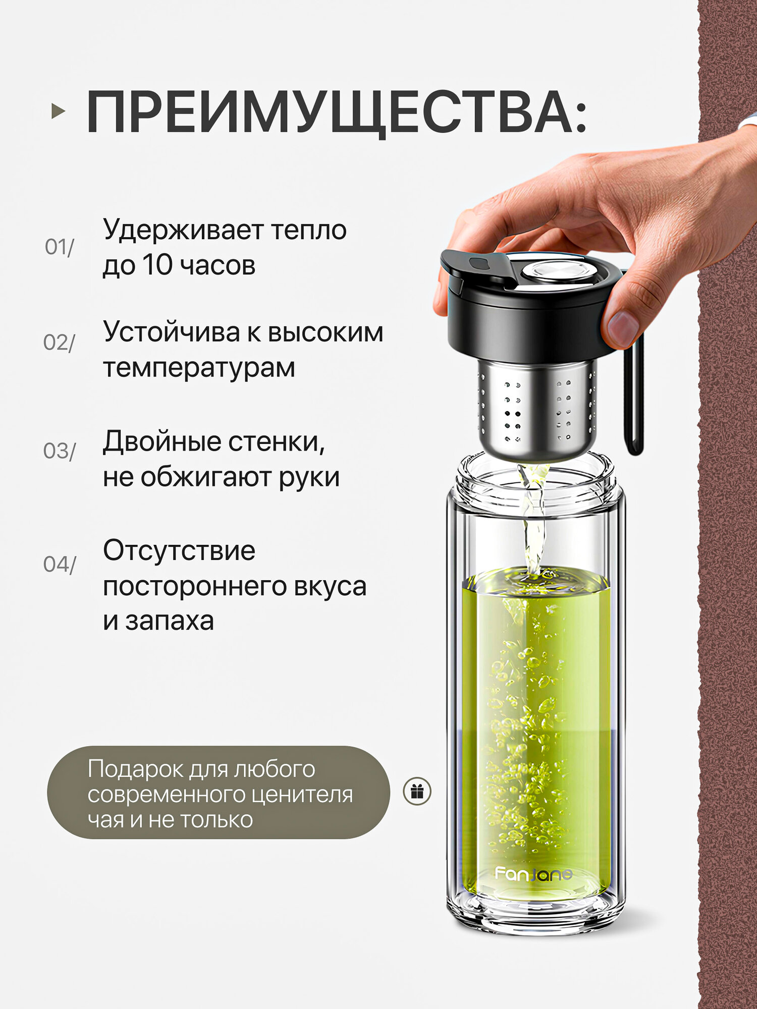 Это позволяет точно контролировать крепость чая или настоя и не допускать переэкстракции.