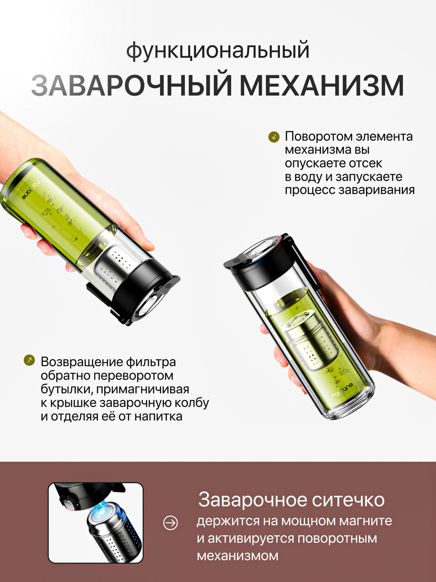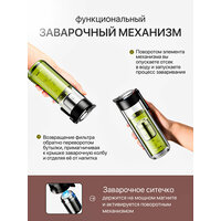 Главная особенность бутылки — заварочный отсек из нержавеющей стали с фильтром-ситечком, расположенный на крышке. Он держится на мощном магните и активируется поворотным механизмом: