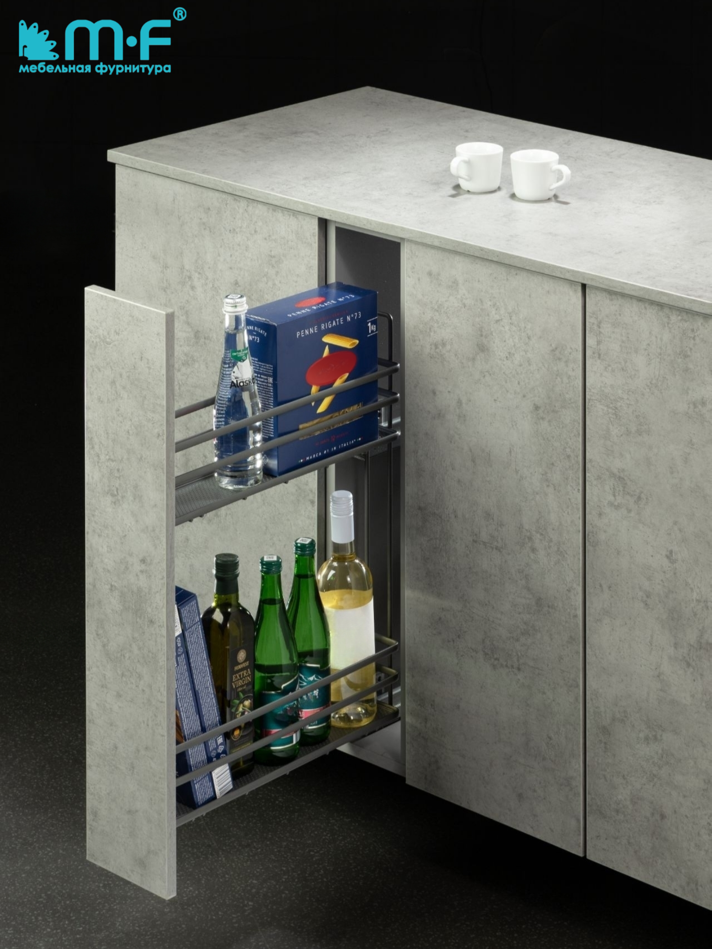 Бутылочница – это высококачественная и функциональная комплектующая для кухонного гарнитура. Предназначена для хранения бутылок и других предметов в кухонных шкафах. Она имеет два уровня, что позволяет эффективно использовать пространство внутри шкафа. Держатель для бутылок оснащен направляющими полного выдвижения с доводчиком и имеет возможность регулировки по горизонтали. Выдвижная корзина выполнена из прочного материала, который обеспечивает ее долговечность и надежность. Она имеет боковое крепление и легко монтируется на левую стенку шкафа. Бутылочница - отличное решение для организации пространства в шкафах и удобного хранения бутылок и других предметов.