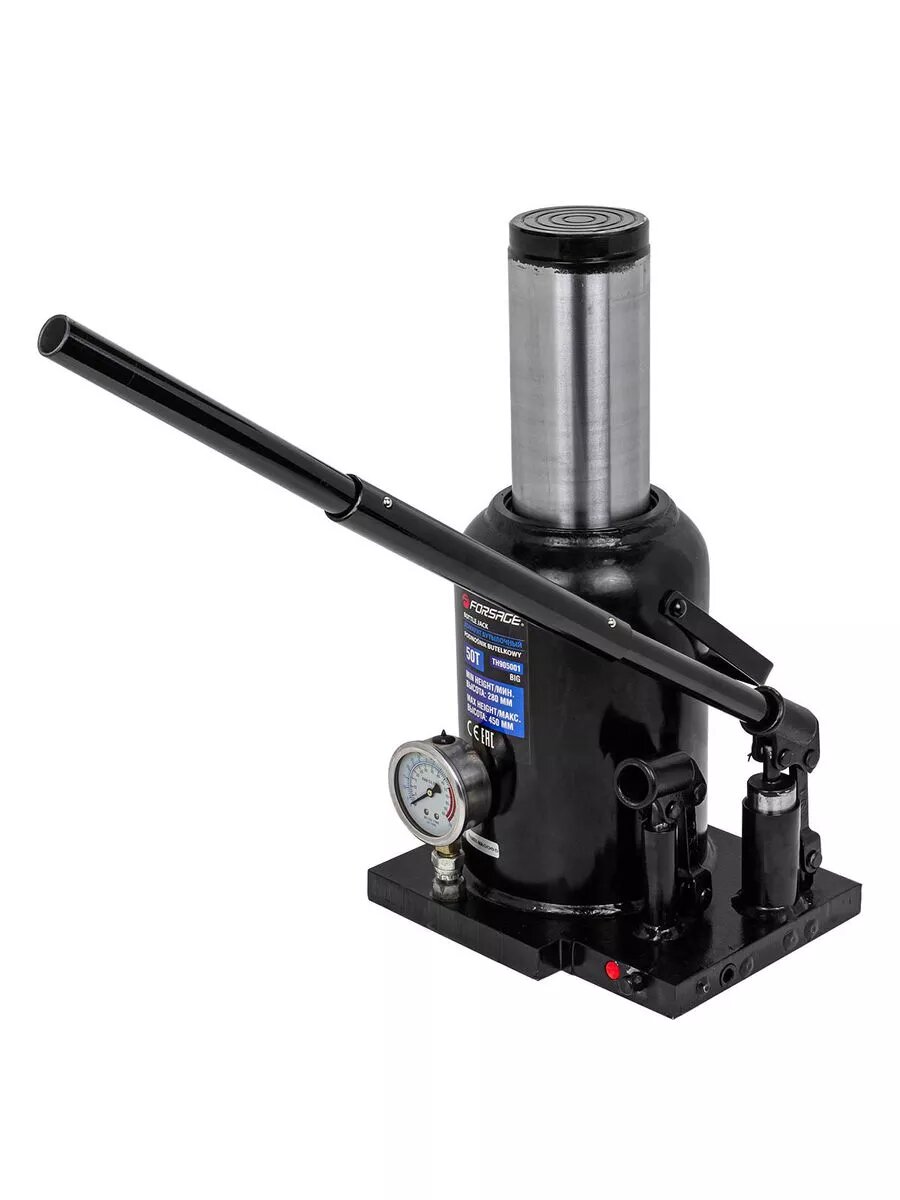 Бренд Forsage - это производитель высококачественного автомобильного оборудования и инструментов для ремонта и обслуживания автомобилей. Компания стремится предоставлять своим клиентам продукцию, которая сочетает в себе высокое качество, надежность и доступность по цене. Домкрат автомобильный бутылочный двухскоростной с манометром от бренда Forsage с грузоподьемностью до 50 тонн, является высококачественным оборудованием, которое предназначено для подъема автомобилей в автосервисах, шиномонтажных центрах для работ по ремонту и техническому обслуживанию. Гидравлический домкрат обеспечивает высоту подъема 450 мм, высоту подхвата 280 мм. Домкрат обладает двумя скоростями подъёма. С помощью одной можно быстро привести домкрат в рабочее положение. Вторая служит непосредственно для подъёма груза. Складная рукоять из трёх частей добавляет удобство при транспортировке. С помощью манометра, которым оборудован домкрат, можно контролировать силу, прикладываемую домкратом. Необходимо обязательно сохранять вертикальное положение устройства для предотвращения утечки масла. Домкрат автомобильный оснащен специальным предохранительным клапаном для защиты от перегрузки. Это надежный и прочный инструмент, он поможет Вам быстро и безопасно поднять транспортное средство для проведения ремонтных задач в автомастерских, гаражах, складах и других мест, где требуется подъем и удержание автомобилей.