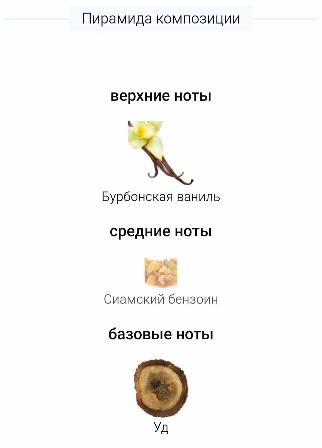 Верхняя нота: Бурбонская ваниль; средняя нота: Сиамский бензоин; базовая нота: Уд.
