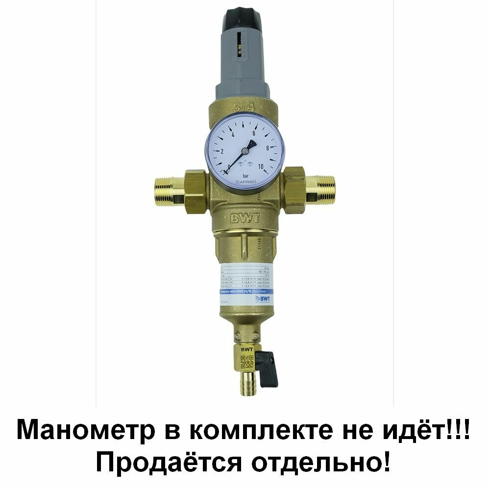 Во-вторых, редуктор давления защитит вашу сантехнику от гидроударов, которые возникают периодически в сетях центрального водоснабжения. Заводская настройка редуктора давления на выходе 4 бар. Но компания BWT предусмотрела регулировку от 2 до 6 бар. Обращаю ваше внимание, для того чтобы регулировать давление нужно приобрести Манометр аксиальный (горизонтальный).