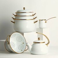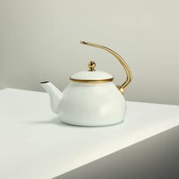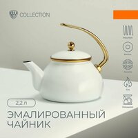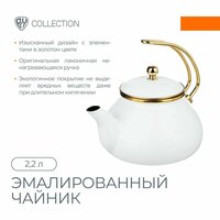 Эмалированный чайник BY Collection объемом 2,2 л – это посуда из высококачественной прочной стали с эмалированным покрытием белоснежного цвета. Экологичное покрытие не выделяет вредных веществ в воду даже при длительном кипячении и не портит вкус напитков. Чайник имеет изысканный дизайн с элементами в золотом цвете, утонченную форму и оригинальную лаконичную ненагревающуюся ручку. Смотрится привлекательно и выразительная, добавляя эстетики в интерьер кухни и сервировку чайного столика. Подходит для всех типов плит, включая индукцию.