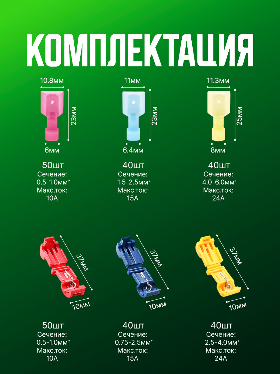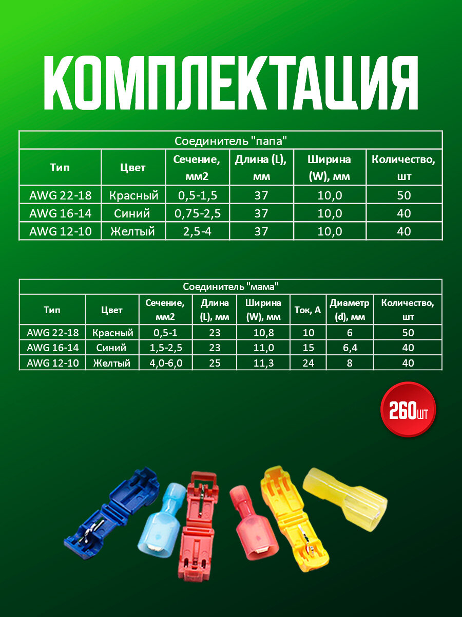 Комплект из 260 быстроразъёмных клемм — идеальное решение для надёжного монтажа проводов. Сечением от 0,5 до 6 мм², эти клеммы обеспечивают высокую термостойкость благодаря полипропиленовому материалу и отличную электропроводимость с чистым медным проводником. В комплект входит удобный кейс для хранения, который делает набор незаменимым для профессиональных электриков, автолюбителей и строителей. Преимущества, такие как лёгкий монтаж и надёжное соединение, позволяют сэкономить время и обеспечивают высокий уровень безопасности в любых электрических системах.