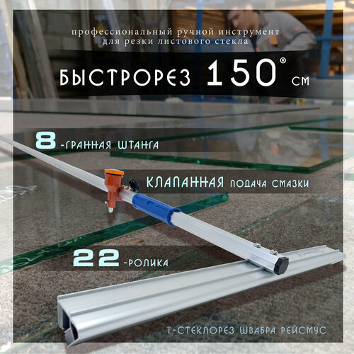 Профессиональный 22-роликовый Т-быстрорез стеклорез для параллельной резки листового стекла, зеркала, с длиной штанги 1530 мм. В качестве смазки подходит масло или керосин. Длина колёсного блока с роликами составляет 490 мм. Заводское производство компании "JM" Китай.