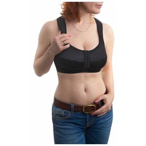 В нашем магазине это первая модель послеоперационного бюстгальтера с передней застежкой. Обратите внимание, бретели не регулируются по длине; ; Очень красивый серый цвет смотрится стильно, кружев нет; ; Ортопедический бюстгальтер мягкий, без косточек. Расширенные лямки изнутри продублированы поролоном, к плечам прилегают хлопковой основой; ; Передняя застежка завышена и состоит из 7 крючков в два ряда, благодаря чему хорошо скрывает послеоперационные швы; ; Спинка не усилена, поэтому в бюстгальтере не будет жарко; ; Кармашки для протезов двусторонние, выполнены из хлопкового трикотажа; ; Бюстгальтер можно носить как обычное белье.