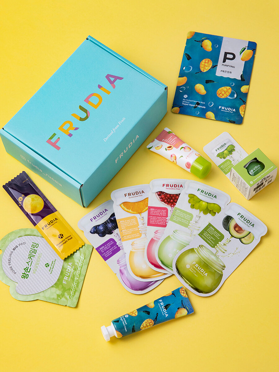 | В наборе | Питательная ночная маска с черникой и медом, 5 мл Отшелушивающие диски с зеленым виноградом, 3 мл Смягчающая маска с манго, 20 мл Пенка-моти очищающая c персиком мини, 30 г Крем для рук c манго, 30 г Себорегулирующий крем с зеленым виноградом мини, 10 г Пробные версии 5 кремов Frudia: с черникой, с гранатом, с авокадо, с зелёным виноградом и экстрактами цитрусовых |