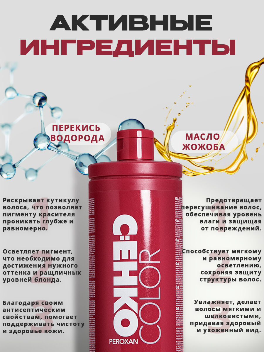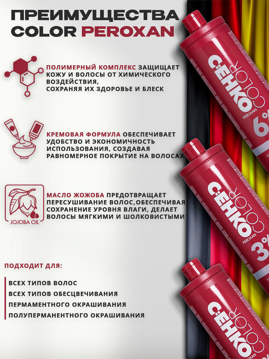 | Дополнительная информация | С МАСЛОМ ЖОЖОБА. Пероксан рекомендован для использования при всех типах осветления волос блондирующими средствами и окрашивания волос окислительными красителями. Благодаря ухаживающим полимерам повышается интенсивность цвета и блеск волос. |