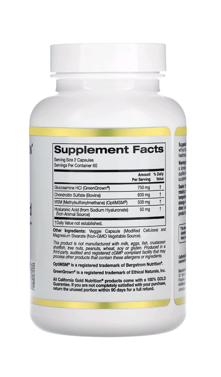 California Gold Nutrition® Глюкозамин, хондроитин, МСМ с гиалуроновой кислотой содержит запатентованный глюкозамин GreenGrown® и метилсульфонилметан OptiMSM®, а также хондроитин, полученный от крупного рогатого скота, и гиалуроновую кислоту неживотного происхождения. В составе отсутствуют ракообразные. Такая формула обеспечивает поддержание здоровья и гибкости суставов.*