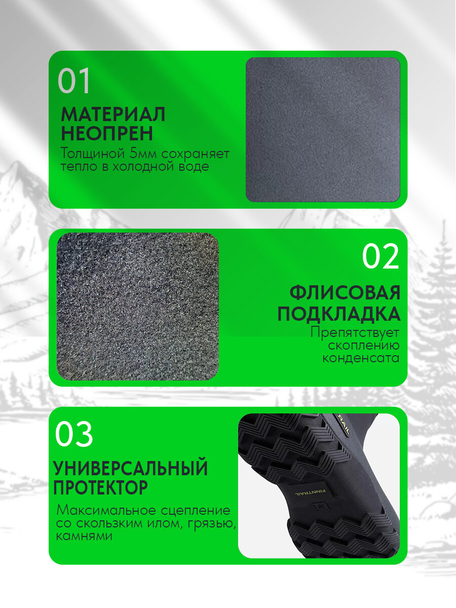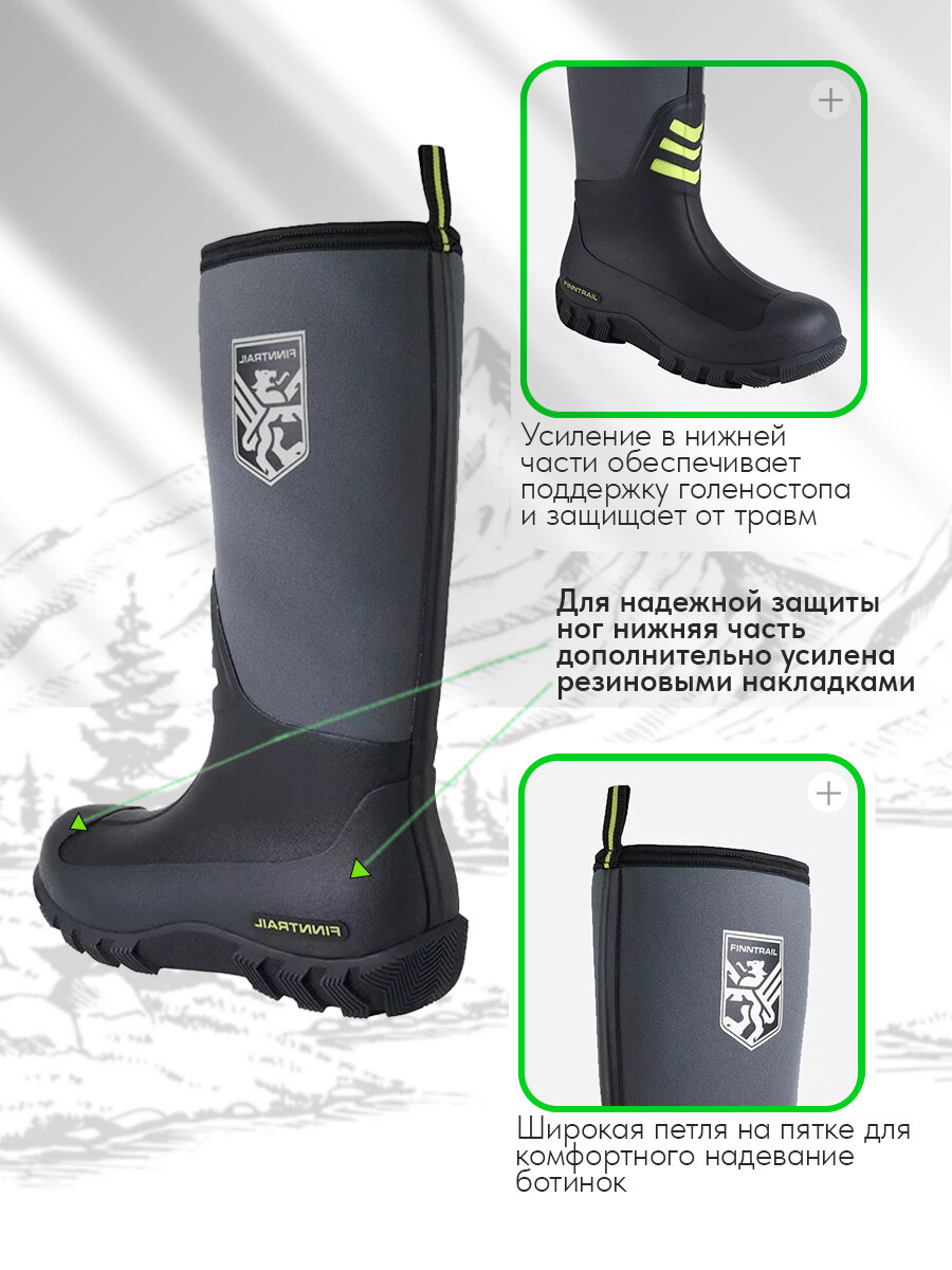5-миллиметровый слой неопрена защищает от воды и сохраняет тепло. Специальная подкладка эффективно предотвращает скапливание конденсата. Резиновые накладки на нижней части сапог защищают от истирания и повреждений. Подошва сконструирована таким образом, чтобы обеспечивать надежное сцепление с поверхностью на пересечённой местности, не позволяя грязи и песку забиваться в рисунок протектора. Дополнительный усиленный материал в районе голеностопа предотвращает травмы и растяжения, обеспечивая максимальный комфорт и безопасность. Сапоги с функциональным дизайном объединяют в себе продуманные детали и оригинальную серую расцветку с красными элементами. В районе голени закреплены петли, позволяющие быстро и комфортно надевать или снимать обувь.