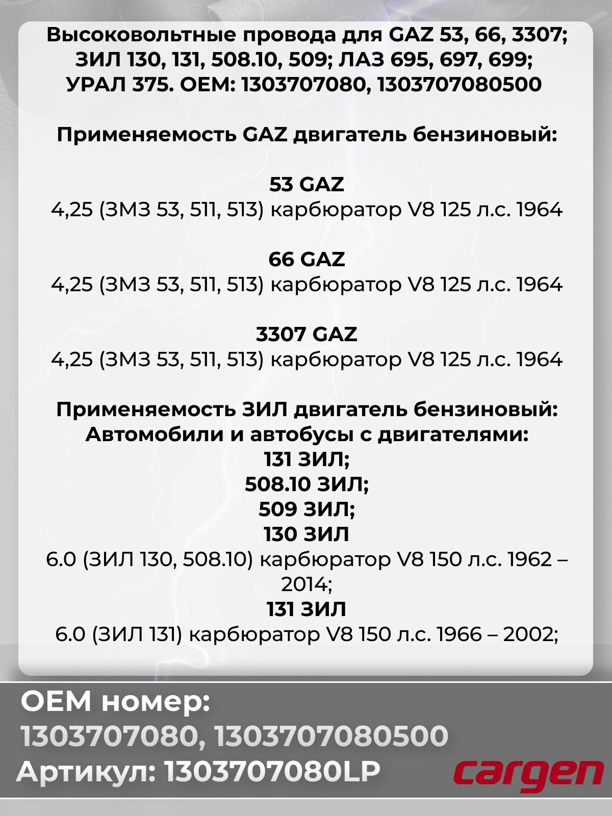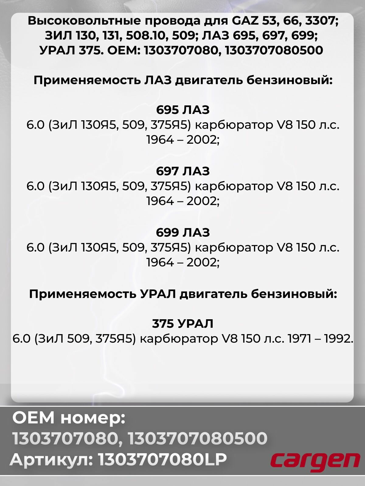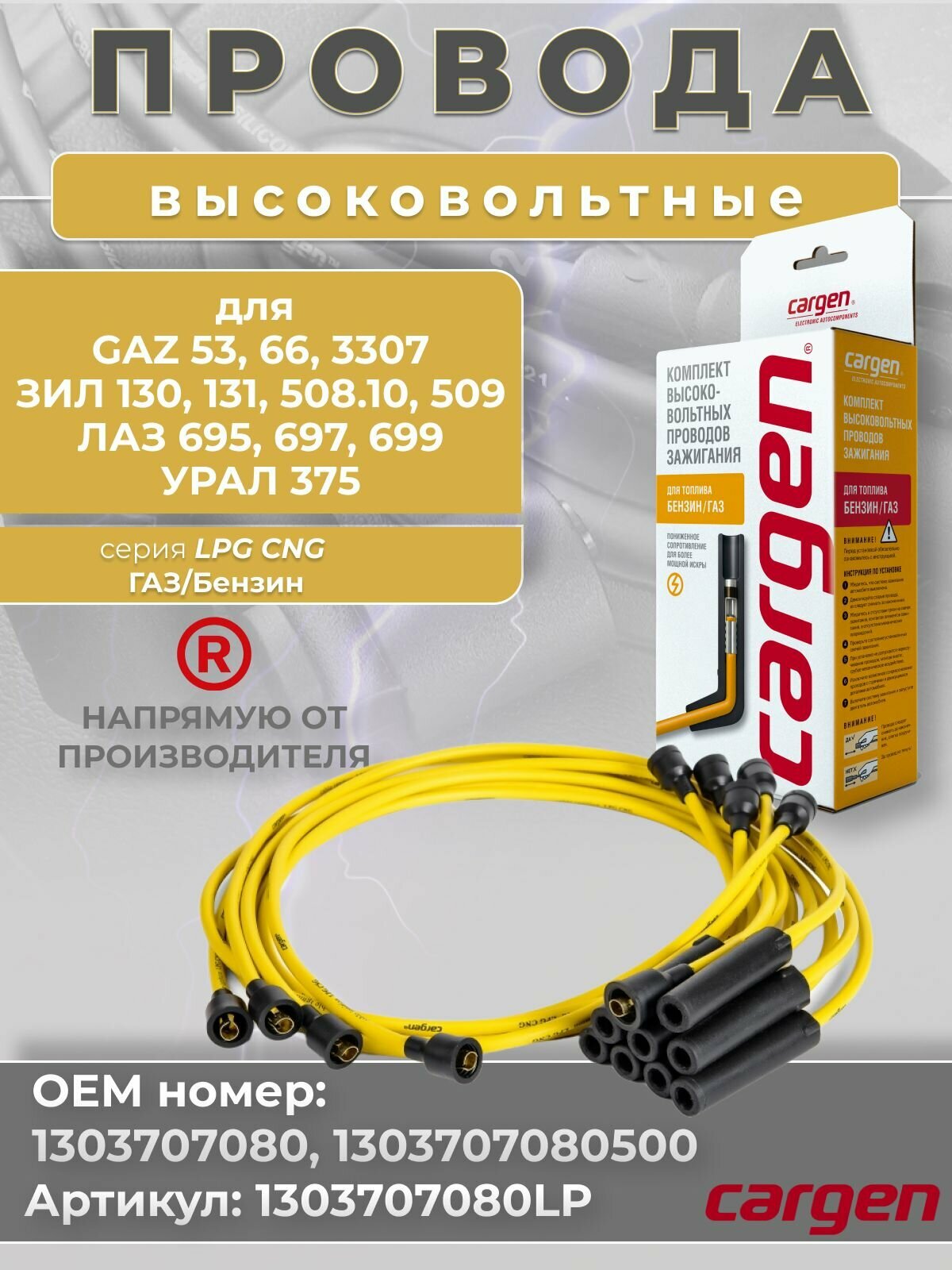 Высоковольтные провода для ГАЗ 53 66 3307 / ЗИЛ 130 131 508.10 509 / ЛАЗ 695 697 699 / урал 375 комплект серии LPG OEM: 1303707080 1303707080500: сравнение цен, характеристики, фото, актуальное наличие и цены.